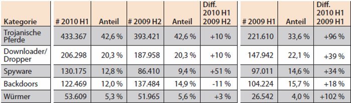 Der Anteil von Backdoors ist im Vergleich zum letzten Halbjahr 2009 gesunken und kommt mit 12% auf den vierten Platz. Mit Hilfe dieser Computerschädlinge verschaffen sich Online-Kriminelle beispielsweise einen Fernzugriff auf Computer erlauben. Mit 53.609 Würmern belegen die schädlichen Programme den letzten Platz der Top 5.