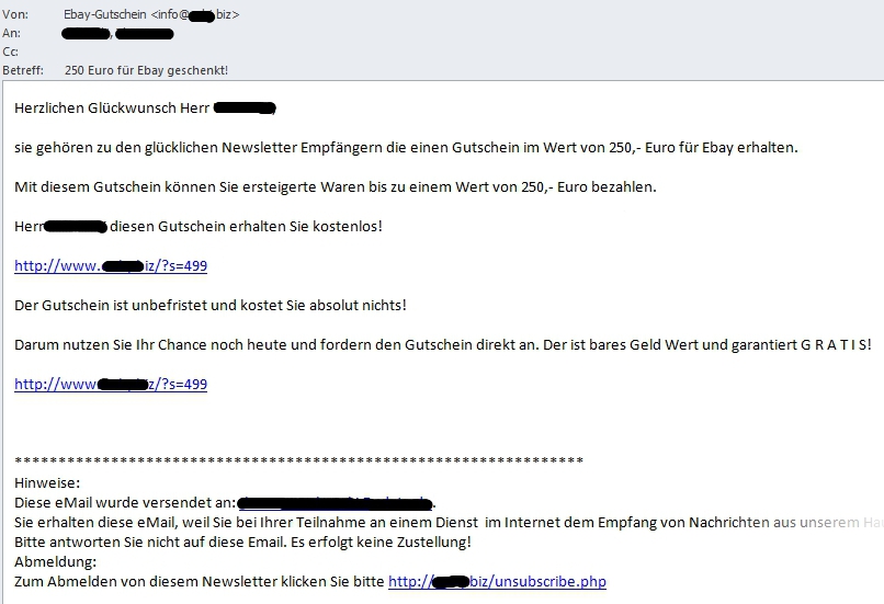Sie gehören zu den glücklichen Newsletter Empfängern die einen Gutschein im Wert von 250,- Euro für Ebay erhalten.