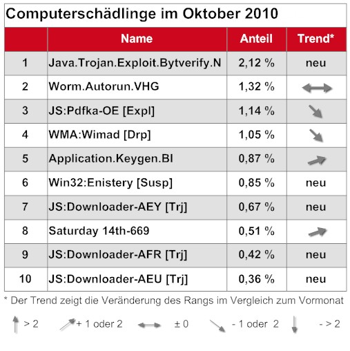 (pressebox) (Bochum, 05.11.2010) Onlinekriminelle setzen für die Verbreitung von Schadcode stärker als in den vergangenen Monaten auf Sicherheitslücken in Java. Zu diesem Ergebnis kommen die Experten der G Data SecurityLabs nach Analysen des Vormonats und verzeichnen erstmals seit Februar eine Veränderung an der Spitze der Malware-Top-Ten. Stellten bisher PDF-Schwachstellen die größte Bedrohung dar, wurden diese jetzt durch einen Java-Exploit abgelöst. Java.Trojan.Exploit.Bytverify.N ist auf gehackten Webseiten zu finden und versucht mit manipulierten Java-Applets Windows-Rechner per Drive-by-Dowload zu infizieren. G Data empfiehlt neben einem unverzichtbaren Echtzeitschutz des PCs auch zwingend die Aktualisierung jeglicher installierter Software.