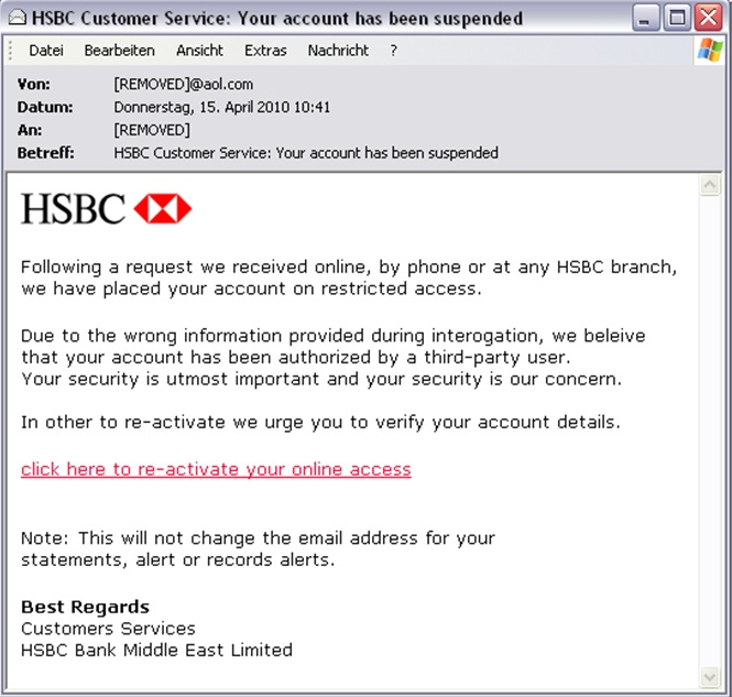 Bei einem Benutzerkonto des Opfers, z.B. für ein soziales Netzwerk, Online Banking oder einen Online Shop, soll es angeblich zu Unregelmäßigkeiten gekommen sein. Der Nutzer wird in der E-Mail aufgefordert, seine Zugangsdaten sofort auf einer Webseite einzugeben, zu der ein Link in der Nachricht enthalten ist. Kommt er dieser Aufforderung nicht nach, würde das Nutzerkonto sofort gesperrt. Die eingefügte URL führt den Anwender auf eine täuschend echt aussehende, nachgebaute Internetseite. Die Betrüger „phishen“ bei dieser Methode gezielt persönlichen Daten, insbesondere Bankdaten.