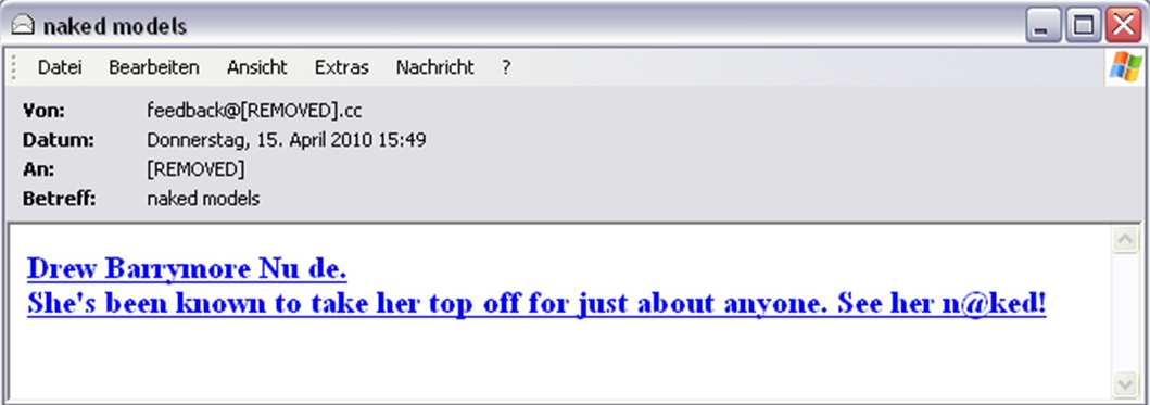 Die Kriminellen preisen hier vermeintlich peinliche oder skandalöse Bilder und Videos, beispielsweise von Prominenten oder zu aktuellen Ereignissen an. Die Mail enthält entweder einen infizierten Ahang oder einen Link zu einer verseuchten Webseite. Der Schadcode, mit dem der Nutzer seinen Computer infiziert kann u.a. den PC in ein Botnetz einbinden, oder Passwörter und sensible Daten ausspähen.
