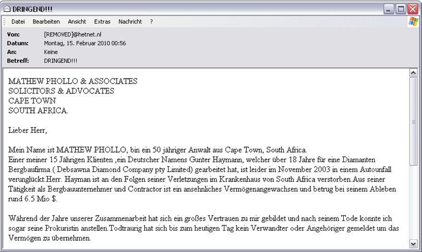Der E-Mail-Empfänger soll aufgrund eines Todesfalls ohne Erben oder anderen, vorgeschobenen Gründen eine größere Menge Geld bekommen. Als einzige Voraussetzung für den Erhalt der Summe wird die Kontaktaufnahme genannt. Nach dem ersten Kontakt mit dem Betrüger soll das Opfer Gebühren bezahlen, die eine Überweisung möglich machen oder die Gebühren für Behörden, Anwälte etc. begleichen soll. Am Ende erhält das Opfer weder die versprochene Summe, noch bekommt es die geleisteten Zahlungen zurück.