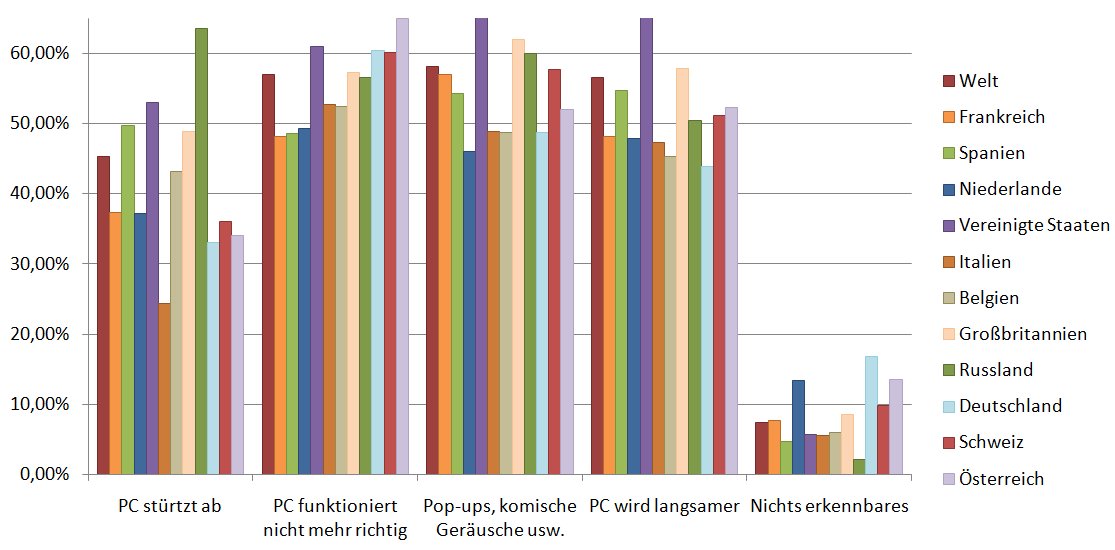 Weltweit sind neun von zehn Internetnutzern fatalerweise der Ansicht, dass sie einen Schadcode-Befall ihres PCs, beispielsweise durch einen Absturz, eingeschränkte Funktionalität oder Pop-up-Fenster, feststellen können. Bei den russischen Nutzern gehen sogar 98% von einem wahrnehmbaren Effekt aus, sie rangieren daher auf dem letzten Platz im Ländervergleich. In Deutschland glauben dagegen acht von zehn Befragten an die Sichtbarkeit einer Infektion und erzielen so noch das beste Ergebnis.