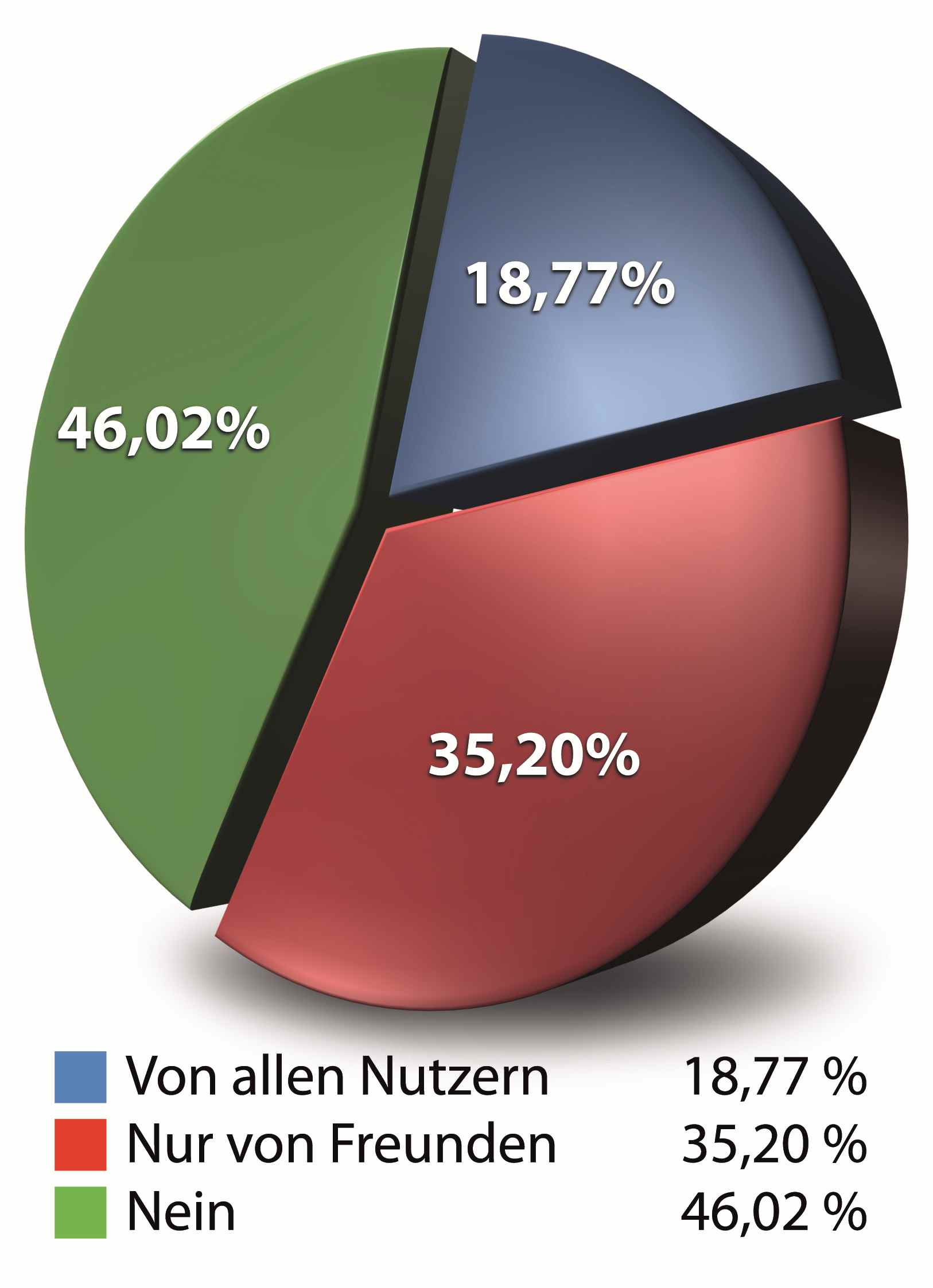 Fast jeder fünfte Befragte geht ein besonders hohes Risiko in sozialen Netzwerken ein: Sie wählen in Portalen URLs an, unterscheiden dabei aber nicht zwischen Links von Freunden und unbekannten Netzwerkern. Diese Nutzer laufen daher leicht Gefahr, in die Falle von Online-Kriminellen zu tappen. Im Gegensatz dazu lehnen 46 Prozent das Anklicken von Links kategorisch ab. Die dritte Gruppe der Befragten nutzt ausschließlich Links, die Mitglieder des eigenen Netzwerkes veröffentlicht haben. (s. Diagramm "Jeder 5. Nutzer klickt auf alle veröffentlichten Links in sozialen Netzwerken")
