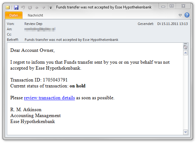 Die entdeckten Spam-Mails haben unterschiedliche Absender und sind auf verschiedene Banken bezogen. Die enthaltene Transaktions-ID ist wahrscheinlich zufällig gewählt und daher nicht auf einen realen Bezahlvorgang bezogen.