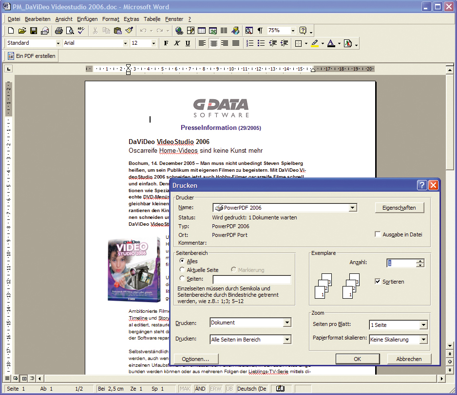 Das neue PowerPDF 2006 schafft den schwierigen Spagat zwischen einfacher Bedienbarkeit und professionellen Funktionen. Der PDF-Konverter installiert sich als Druckertreiber und kann so aus allen Programmen mit Druckfunktion gestartet werden. In Microsoft Word und MS Excel können auf Knopfdruck PDFs erstellt werden - mit automatischer Einbindung von interaktiven HTML-Links oder E-Mail-Verknüpfungen.