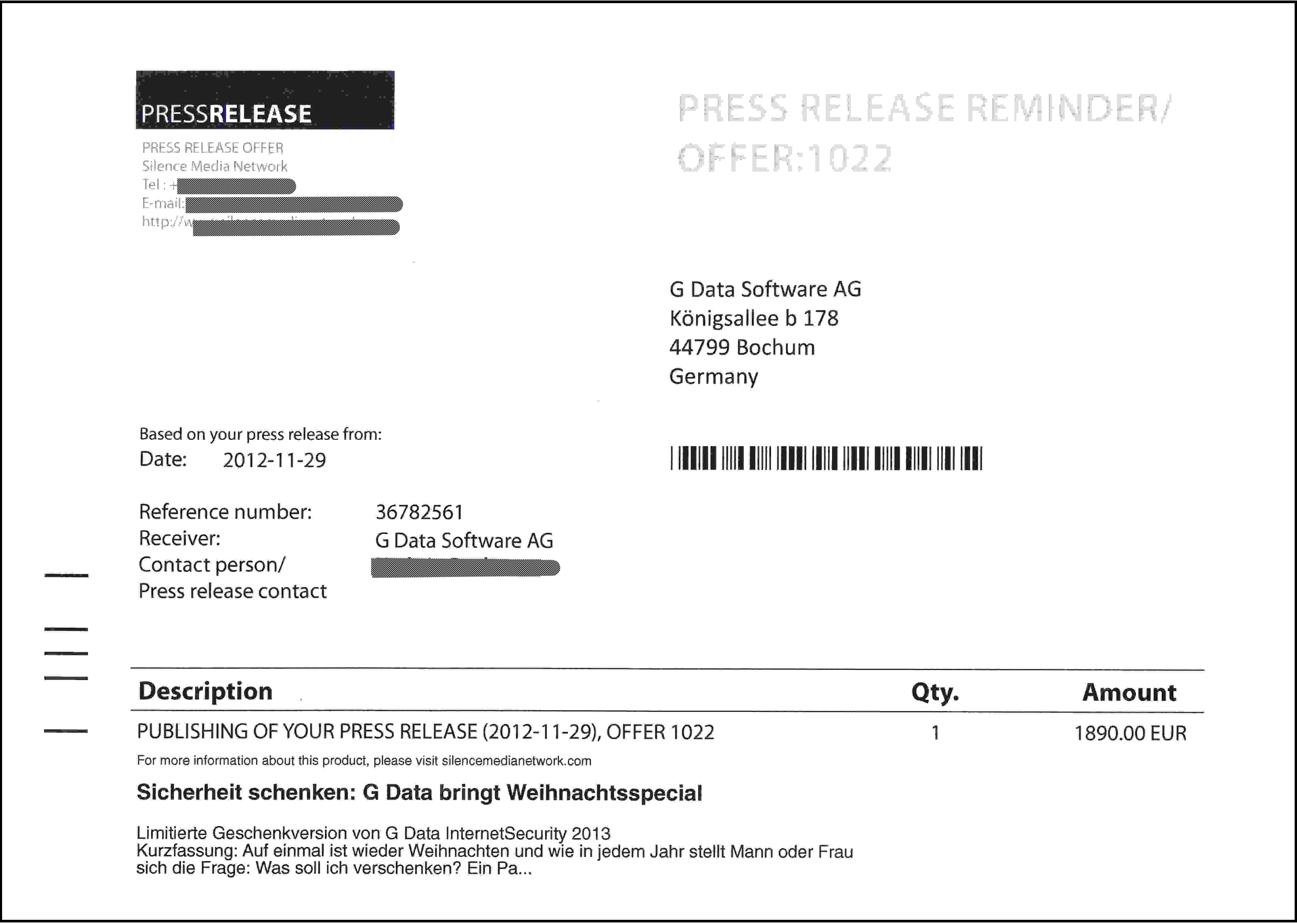 (pressebox) (Bochum, 09.01.2013) Der Einsatz leistungsstarker IT-Sicherheitslösungen mit wirkungsvollen Antispam-Technologien ist in den meisten Unternehmen selbstverständlich. Das erschwert die Arbeit der digitalen Trickbetrüger immens und zwingt sie dazu, neue Wege einzuschlagen bzw. alte wieder zu entdecken: „Back to the roots“ scheint in einer aktuellen Kampagne somit das Motto einer Tätergruppe zu sein, die Pressestellen und PR-Agenturen ins Visier nehmen. Per Briefpost versenden diese Rechnungen für die angebliche Online-Verbreitung von Unternehmensmeldungen. Unter dem Namen „Silence Media Network“ firmiert der vermeintliche Dienstleister, der auf seiner Internetseite plakativ mit Logos großer Medienunternehmen und Nachrichtenagenturen wirbt. Im aktuellen Betrugsversuch nutzen die Täter die frei zugänglichen Informationen großer Online-Presseportale. Die Versender gehen dabei äußerst professionell vor: Der Versand erfolgt auf wertigem Geschäftspapier, die als Rechnungen getarnten Angebote sind allesamt personalisiert und beinhalten zudem einen Auszug einer bereits veröffentlichten Meldung. Die eingeforderte Summe beträgt entweder 580 Euro oder 1.890 Euro. Die Zahlungsabwicklung erfolgt per niederländischen Payment Provider. Nach ersten Recherchen handelt es sich um eine groß angelegte Versandaktion. Sollte diese Masche erfolgreich sein, rechnet G Data mit einer Ausweitung dieser Masche und dem Aufleben von „Spam“ per Briefpost.