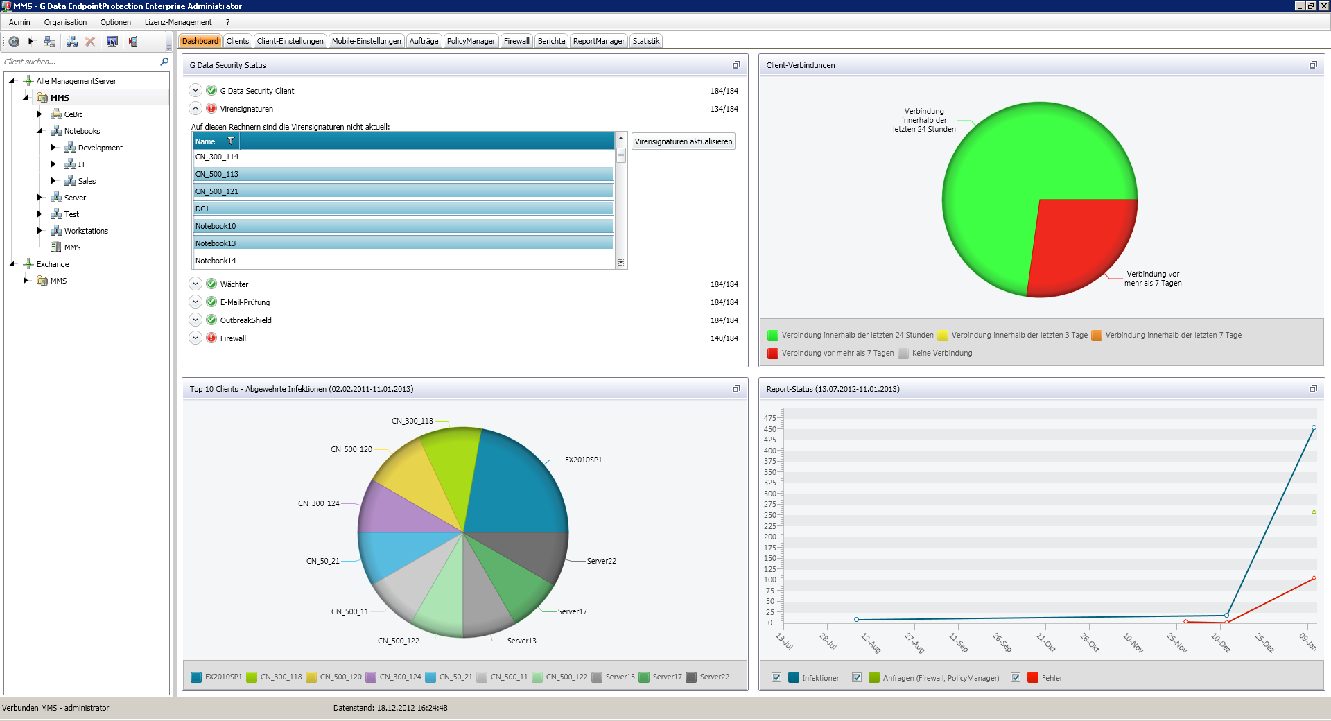 Welche Clients werden oft angegriffen und sind bei allen PCs die Virensignaturen auf dem aktuellsten Stand? Dank des übersichtlichen Dashboards und des Advanced Report Managers habhaben Administratoren den Sicherheitsstatus ihres Netzwerkes und alle weiteren wichtigen Informationen jederzeit im Blick. Vorgänge wie Scan-Aufträge oder die Installa-tion neuer Clients lassen sich dank der zentralen Management-Konsole und einer intuitiven Benutzerführung einfach und schnell erledigen – das spart Aufwand und Zeit.