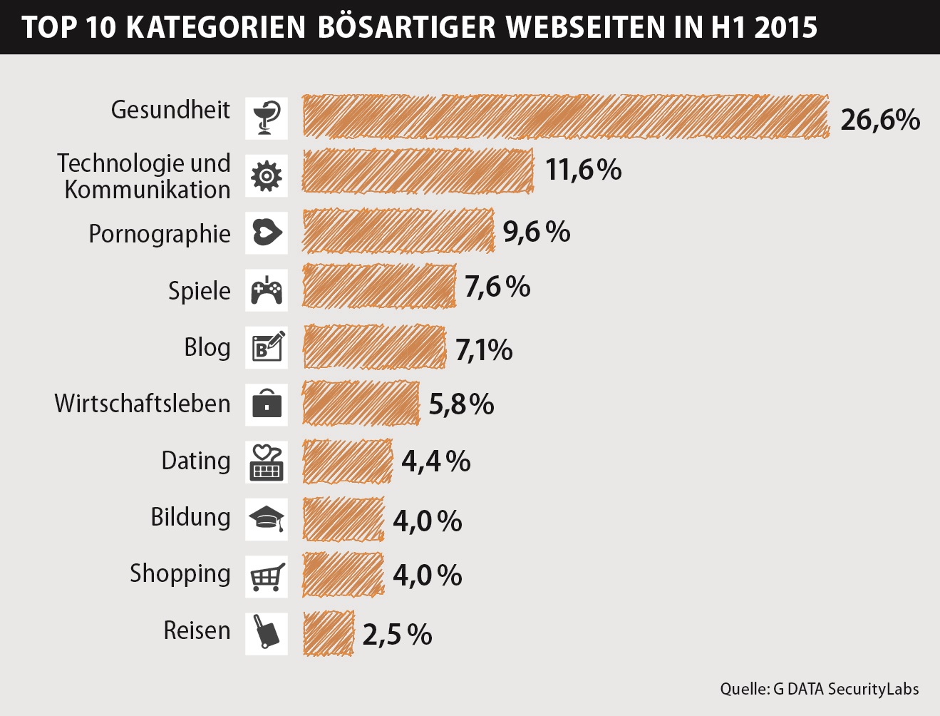 Mehr als ein Viertel der von den G DATA SecurityLabs entdeckten bösartigen Webseiten gehört zur Kategorie Gesundheit, hierunter fallen insbesondere Online-Apotheken und weitere Verkaufs- und Informationsplattformen aus dem pharmazeutischen Bereich.