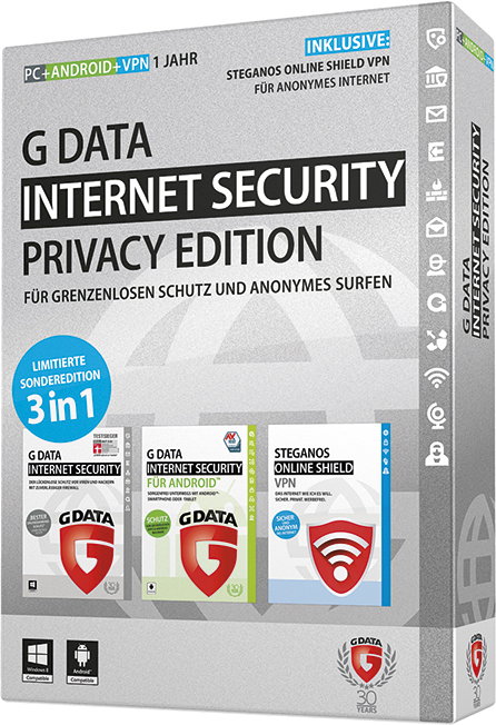 Das exklusive Sicherheitspaket enthält eine Lizenz für die G DATA INTERNET SECURITY, eine G DATA INTERNET SECURITY FÜR ANDROID für mobile Geräte sowie eine Lizenz für Steganos Online Shield VPN, die für beide G DATA Lösungen gilt. Die Sonderedition 3 in 1 bietet somit besten Rundumschutz in der virtuellen Welt – egal ob beim Online-Banking oder –Shopping.