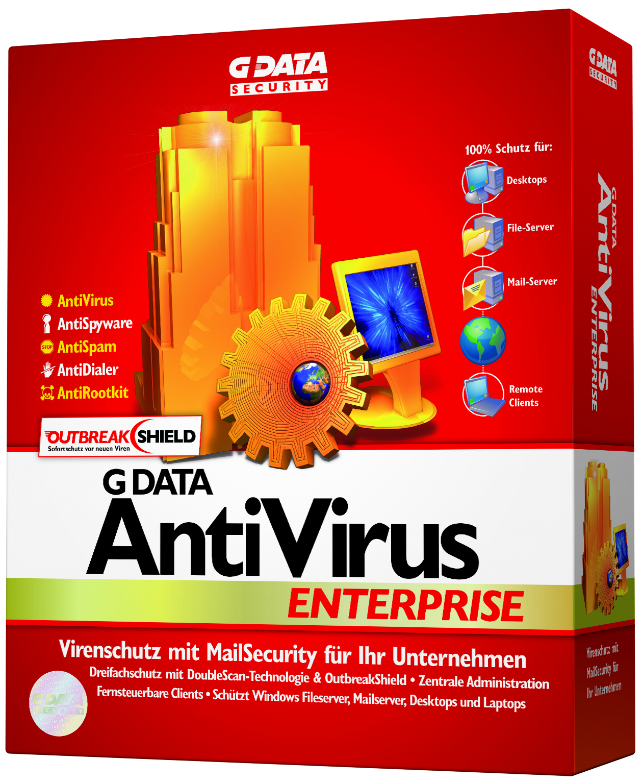 AntiVirus Enterprise ist der umfassende High-End-Schutz für Unternehmensnetzwerke. Es beinhaltet G DATA AntiVirus Business und erweitert es um G DATA MailSecurity, eine mailserver-unabhängige MailGateway-Lösung. Sie kontrolliert alle ein- und ausgehenden E-Mails (SMTP und POP3) auf potentielle Infektionen. Auch hier schützt OutbreakShield gateway-seitig zuverlässig vor Schädlingen aller Art.