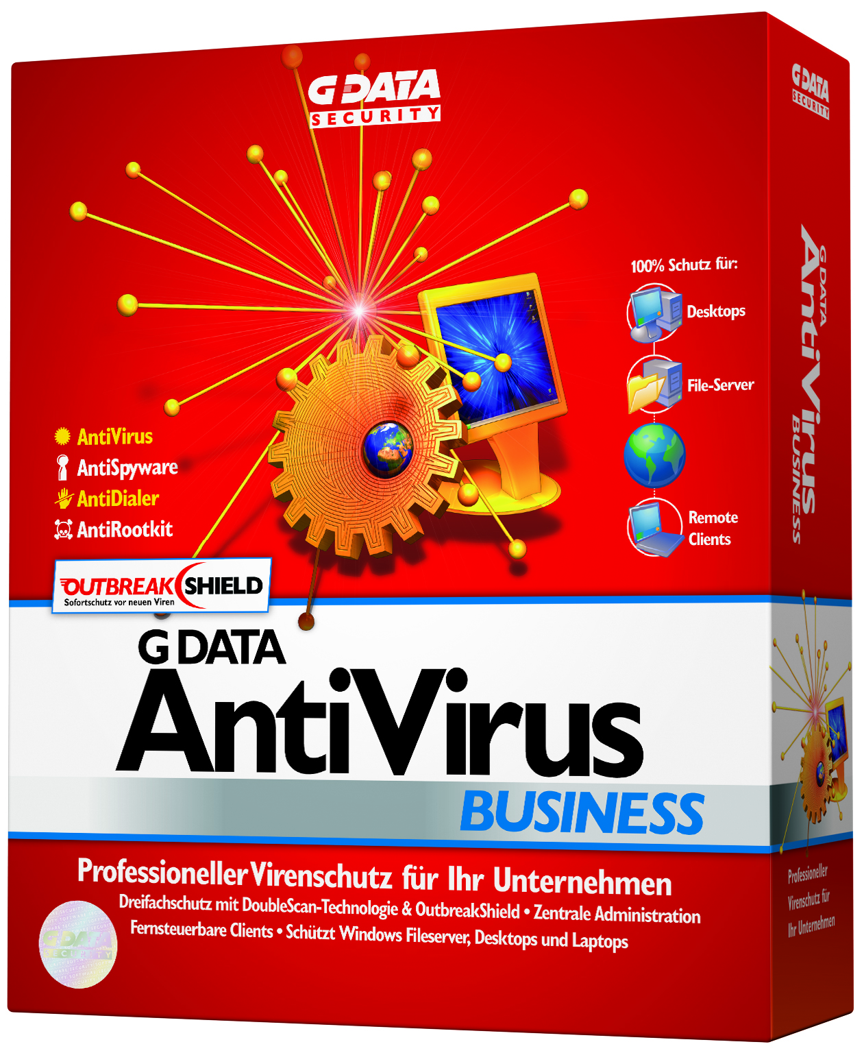 Die Herausforderungen bei der Entwicklung von Sicherheitskonzepten für Unternehmen sind im Zuge der Integration des Internets in Geschäftprozesse deutlich gestiegen. Das Gefahrenpotential für kleine und mittelständische Unternehmen hat hierbei deutlich zugenommen. Mit G DATA AntiVirus Business und G DATA AntiVirus Enterprise sind Unternehmen optimal vor Angriffen auf das Firmennetzwerk geschützt. Die Kombination aus DoubleScan- und Outbreakshield-Technologie bildet einen wirksamen Schutzschild vor SPAM-Attacken, Viren, Würmern, Spyware, Rootkits und Trojanern.