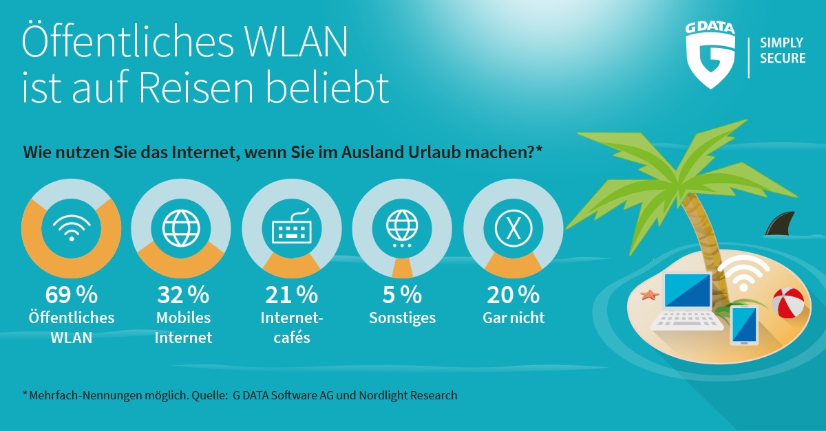 (pressebox) (Bochum, 29.08.2016) 69 Prozent der Internetnutzer loggen sich laut einer G DATA Umfrage auf Reisen in öffentliche WLANs in Cafés oder Hotels ein. Überall online sein – das birgt Risiken. Kriminelle können in diesen Netzen ohne großen Aufwand E-Mails mitlesen oder wichtige Daten, wie Kreditkarteninformationen oder Passwörter, ausspionieren. Um die digitale Privatsphäre zu schützen, ist in der G DATA Mobile Internet Security für das Betriebssystem Android eine VPN-Funktion integriert. Ein virtuelles privates Netzwerk (VPN) schützt in öffentlichen Netzwerken davor, dass Unbefugte sensible Daten mitlesen bzw. stehlen können. Kunden, die bereits G DATA Mobile Internet Security auf ihrem Smartphone oder Tablet einsetzen, können das VPN-Modul optional hinzubuchen.