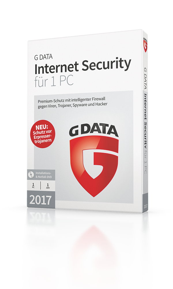 G DATA Internet Security sorgt zuverlässig für die Sicherheit des PCs und der persönlichen Daten – mit bestem Schutz gegen Ransomware, Keyloggern, Exploits und Trojaner sowie einer leistungsfähigen Firewall. Damit sind Internetnutzer vor allen Gefahren geschützt – ganz egal ob beim Online-Banking, -Shopping oder Surfen.
