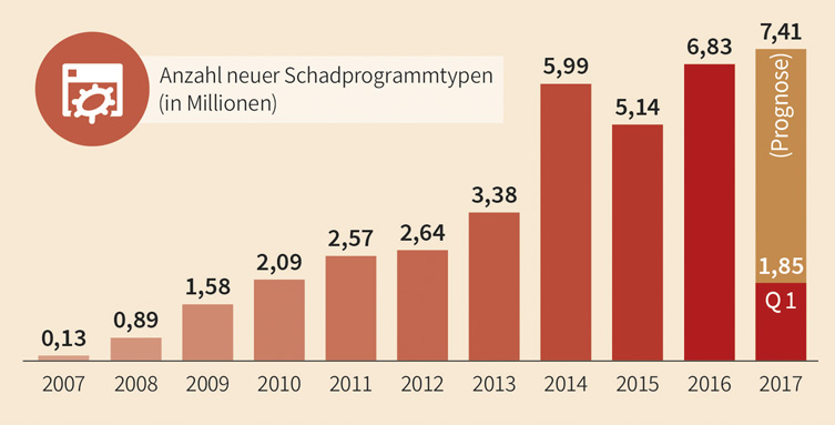 (pressebox) (Bochum, 11.04.2017) 2016 zählten die G DATA Experten 6.834.443 neue Computerschädlinge. Zum Jahr 2015 war dies eine Steigerung von 32,9 Prozent. Im ersten Quartal 2017 setzt sich dieser Trend mit 1.852.945 neuen Schadprogrammtypen fort. Für den Zeitraum bedeutet das: Alle 4,2 Sekunden registrieren die Analysten bei G DATA eine neue Art von Schädlingen. Der Wert liegt 72,6 Prozent über dem vom ersten Quartal 2016. Die G DATA Sicherheitsexperten prognostizieren bis Ende des Jahres einen neuen Negativ-Rekord von 7,41 Millionen neuen Schädlingen.