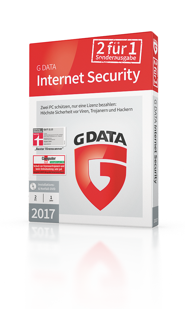 Das limitierte Sicherheitspaket enthält zwei Lizenzen für die G DATA Internet Security 2017. Die Security-Software erhielt in den aktuellen Vergleichstests der Stiftung Warentest und Computer Bild Bestnoten. G DATA Internet Security bietet laut der Verbraucherorganisation Stiftung Wartentest die Note „sehr gut“ für seinen Virenscanner. Die Tester der Computer Bild lobten insbesondere den „perfekten Schutz vor aktuellen Schädlingen“. Die G DATA Anti-Ransomware-Technologie erhielt für die zuverlässige Abwehr von Erpressertrojanern die Note „sehr gut“.