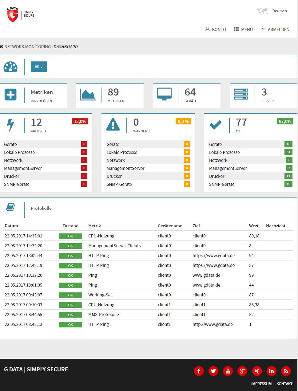 Wo wird der Speicherplatz knapp, reicht die Rechenleistung noch aus und wie ist der Status der Drucker im Firmennetzwerk? Mit G DATA Network Monitoring haben Administratoren ihre IT-Infrastruktur sicher im Blick. IT-Verantwortliche definieren dabei ihre eigenen Metriken und Werte, um die Geräte im Netzwerk zu überwachen. Dabei verfügt das übersichtliche Dashboard über ein Ampelsystem. So ist ein frühzeitiges Eingreifen möglich, bevor es zu unerwarteten Ausfällen oder Beeinträchtigungen in den Arbeitsabläufen im Unternehmen kommt. Das spart Geld und Zeit.