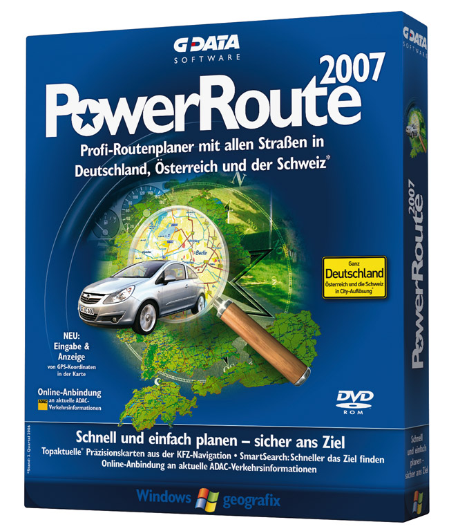 PowerRoute 2007 navigiert sicher durch alle Straßen und Städte in Deutschland, Österreich und der Schweiz. Das Kartenmaterial ist hoch aktuell und beinhaltet das gesamte Straßennetz in City-Auflösung.
