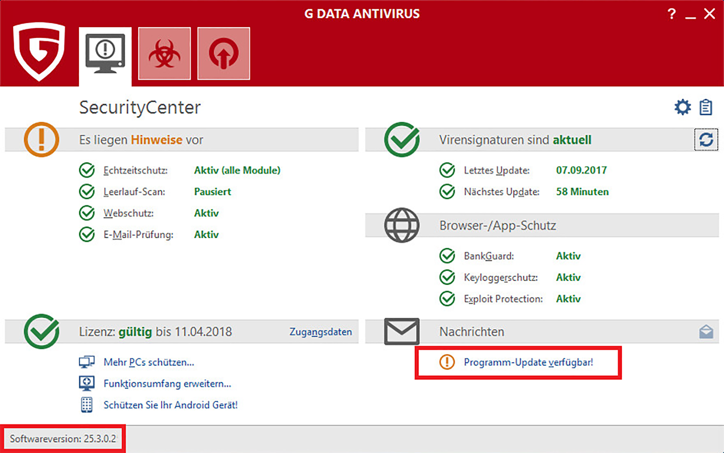 Sobald ein Programm-Update verfügbar ist, erscheint ein Hinweis unten rechts im G DATA SecurityCenter. Mit einem Klick darauf wird der Installationsprozess gestartet. Hinweis: Der deutsche Security-Hersteller stellt das Update (Softwareversion 25.4.0.2) nach und nach allen Kunden zur Verfügung. Daher kann es sein, dass einzelne Kunden den Hinweis zum Update bereits erhalten haben. Die Versionsnummer der installierten Sicherheitslösung ist unten links im G DATA SecurityCenter ersichtlich.