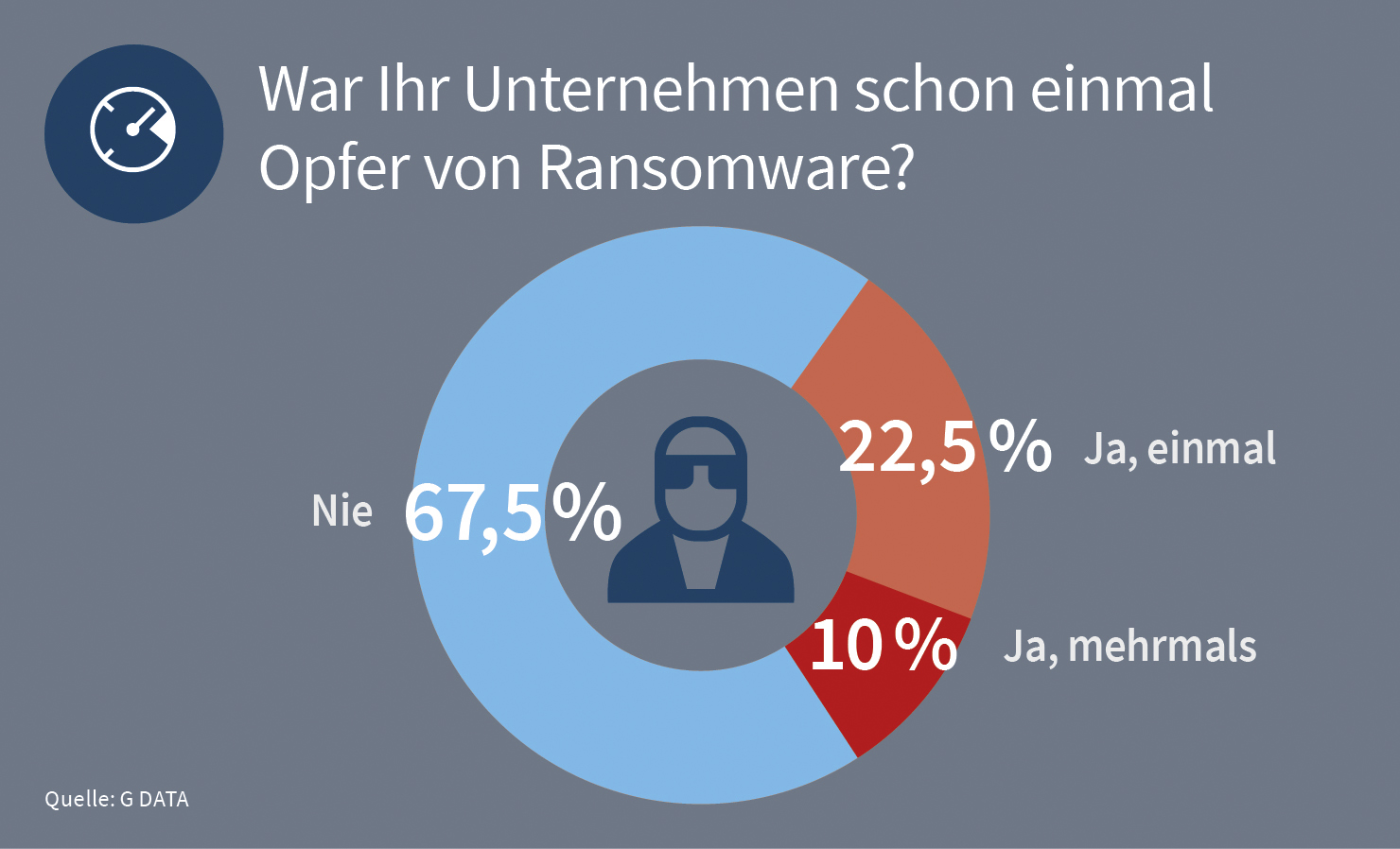 Wie das G DATA Business IT-Security Barometer zeigt, hatten bereits rund 33 Prozent der Mittelständler ein- oder sogar mehrmals mit einer Ransomware-Infektion in ihrem Unternehmensnetzwerk zu kämpfen. Dabei hatten die meisten der Betroffenen einen einmaligen Vorfall zu verzeichnen. Das Ergebnis zeigt, wie gefährlich die Schadprogramme sind und wie wichtig ein effektiver Schutz ist, um IT-Ausfälle und so betriebliche Einschränkungen und finanzielle Verluste zu verhindern.