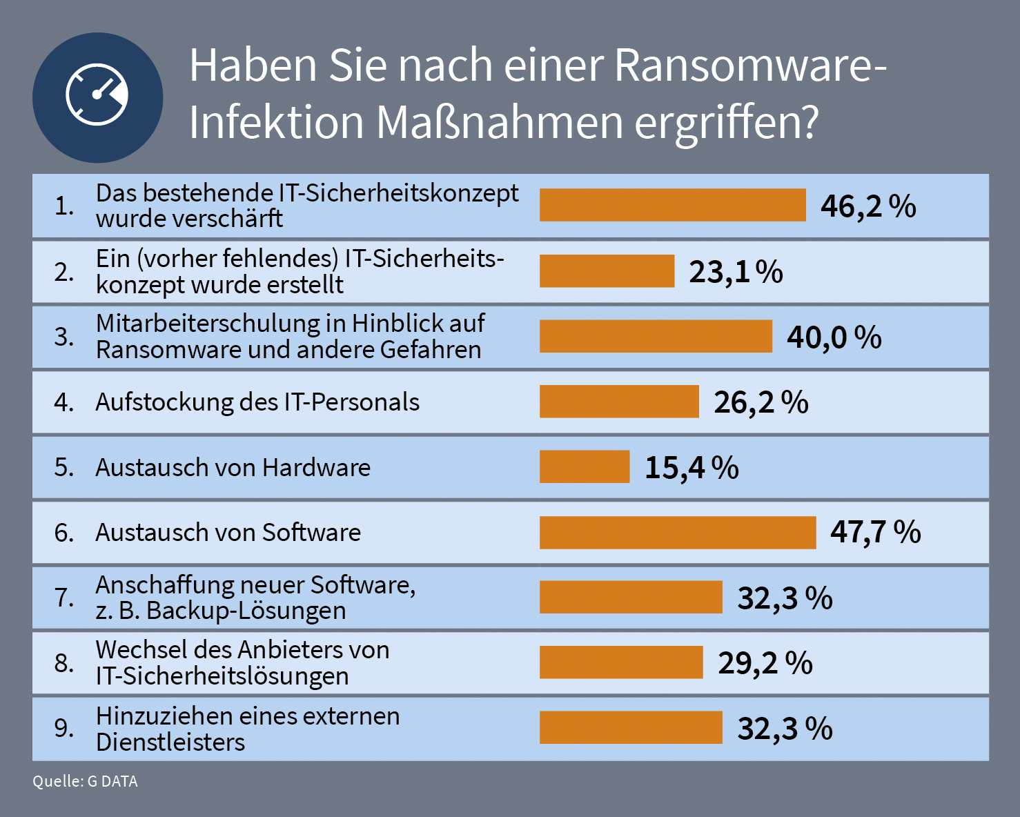 Als Reaktion auf Ransomware-Vorfälle setzten die betroffenen Mittelständler am häufigsten auf den Austausch von Software. In der Vergangenheit nutzen Kriminelle häufig Schwachstellen in Anwendungen aus, um Schadprogramme auf IT-Systeme einzuschleusen. Am zweit häufigsten wurde das bestehende IT-Sicherheitskonzept in den Unternehmen verschärft, um künftige Malware-Vorfälle zu verhindern.