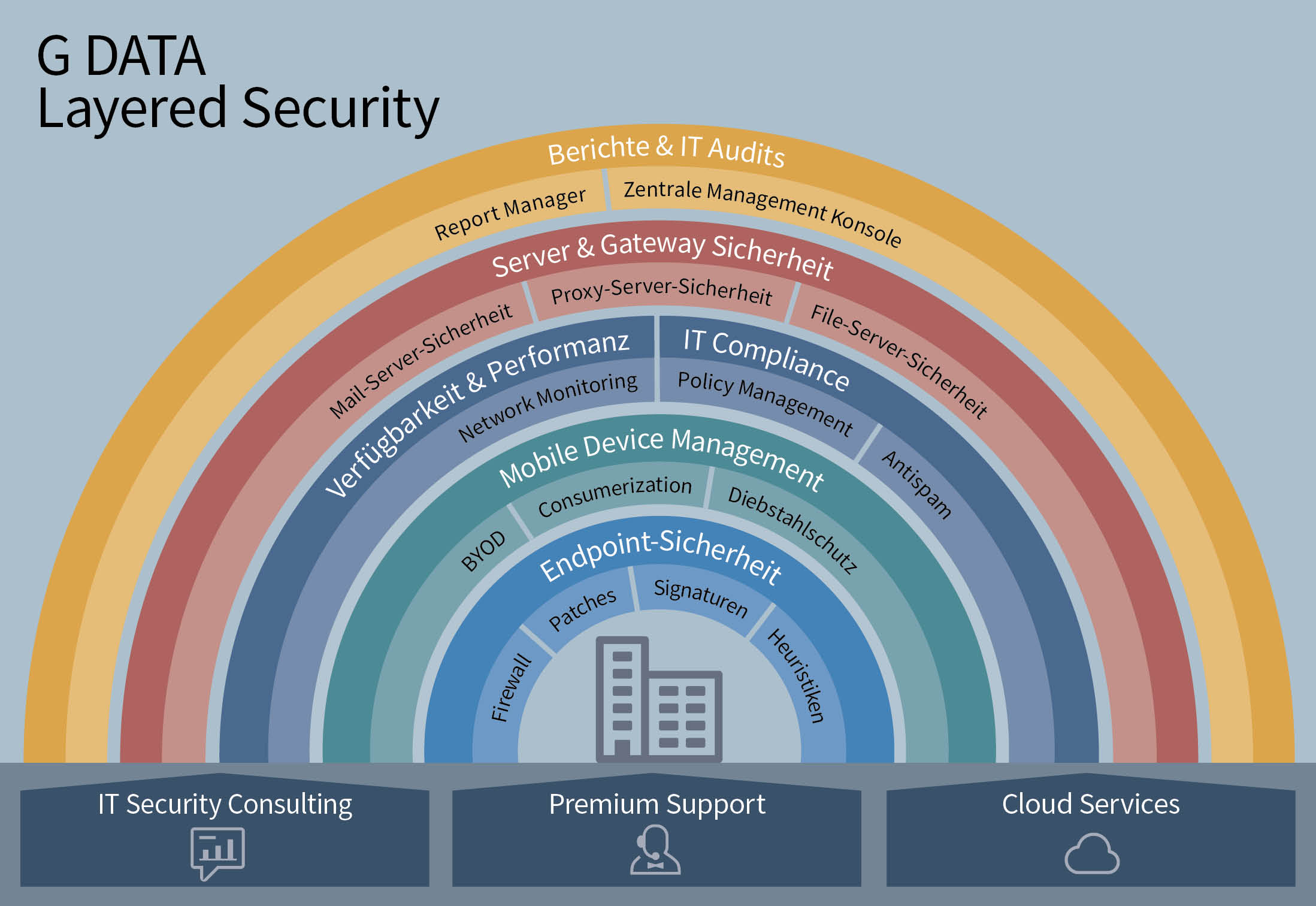 Die Analysten von G DATA entdecken jeden Tag eine Vielzahl neuer Schadprogramme und raffinierter Angriffsmuster, mit denen Cyberkriminelle auf die Jagd nach lukrativen Daten gehen. Unternehmen brauchen daher eine Netzwerklösung, die durchdacht und nach einem ausgeklügelten Sicherheitskonzept aufgebaut ist und mit optionalen Services bedarfsgerecht ergänzt werden kann. G DATA hat sein Business Portfolio nach dieser Idee Schicht für Schicht aufgebaut.