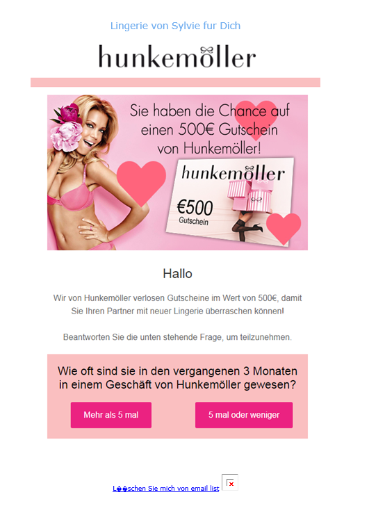 Viele Paare beschenken sich am Tag der Liebenden. Die Mail-Postfächer werden daher oft mit angeblichen Super-Schnäppchen geflutet, in denen beliebte Valentinstags-Geschenke zu besonders günstigen Preisen angepriesen werden. Gehen Anwender darauf ein, ist die Wahrscheinlichkeit hoch, gefälschte oder gar keine Ware zu bekommen, obwohl der Kaufpreis bezahlt wurde.