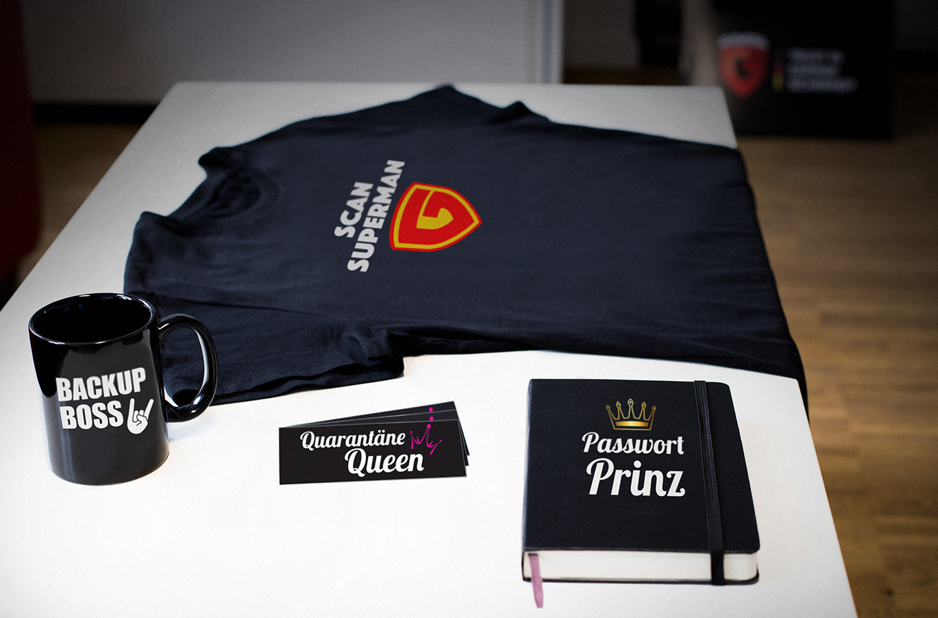 Für Sicherheits-Gurus winken Tassen, T-Shirts, Sticker und Notizbücher