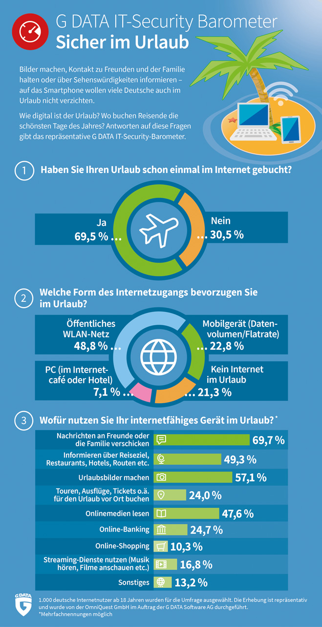 (pressebox) (Bochum, 05.06.2018) Fast 50 Prozent der Deutschen setzt im Urlaub in puncto Internetverbindung auf öffentliche WLAN-Netze - das ergibt das repräsentative G DATA IT-Security-Barometer unter 1.000 Internetnutzern im Mai 2018. Die Gefahr dabei: Die Netzwerke sind oft nur unzureichend abgesichert, wodurch Kriminelle den gesamten Datenverkehr mitlesen können. Im schlimmsten Fall droht Reisenden so der Verlust ihrer persönlichen Daten, wie Passwörter. Anwender sollten freie WLANs daher nur mit Vorsicht nutzen. Ein weiteres Ergebnis der Studie: Auf Reisen verwenden die Deutschen ihr Mobilgerät insbesondere zum Versenden von Urlaubsgrüßen an Freunde und Familie (70 Prozent). Für die sichere Nutzung von Smartphones und Co. auf Reisen stellt das deutsche IT-Security-Unternehmen Nutzern eine Checkliste mit Tipps zur Verfügung – für einen erholsamen und cybercrime-freien Urlaub.