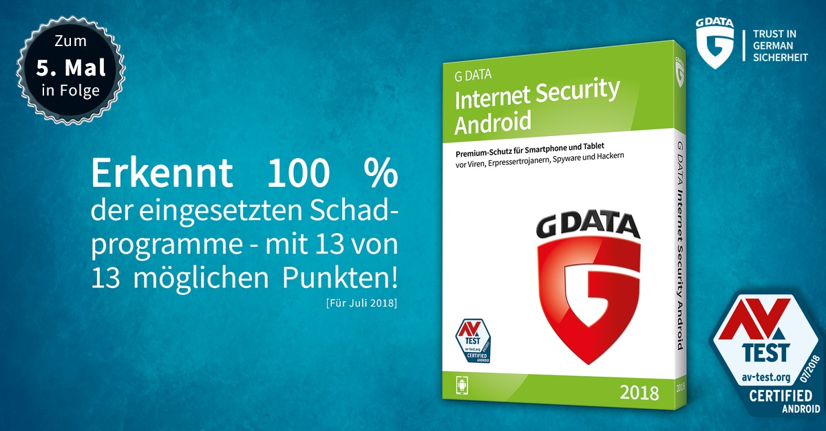 AV-TEST hat im Juli 2018 insgesamt 21 Sicherheitsprodukte für Android untersucht. Dabei wurden die aktuellsten Security-Lösungen verschiedener Hersteller einem umfangreichen Test unterzogen. Bei ihren Untersuchungen berücksichtigt das renommierte Forschungsinstitut AV-TEST nur realistische Testszenarien und prüft die Produkte gegen aktuelle Bedrohungen. Alle Sicherheitslösungen mussten ihre Leistungsfähigkeiten unter Einsatz sämtlicher Funktionen und Schutzebenen zeigen. G DATA Internet Security für Android konnte hier in allen Bereichen und 100 Prozent Erkennungsleistung voll überzeugen. Der deutsche IT-Sicherheits-Hersteller erhielt daher verdient die begehrte AV-TEST-Zertifizierung.