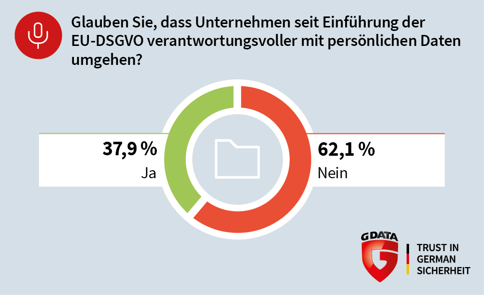 Seit mehr als drei Monaten gilt die EU-Datenschutzgrundverordnung. Viele Unternehmen mussten Anpassungen vornehmen, um den Regelungen zu entsprechen und Informationen besser abzusichern. G DATA hat daher die Deutschen gefragt, ob sie eine Veränderung festgestellt haben. Das Ergebnis: Die Mehrheit der Teilnehmer (62 Prozent) glaubt nicht, dass Firmen seit dem Inkrafttreten der EU-DSGVO verantwortungsvoller mit persönlichen Daten umgehen.