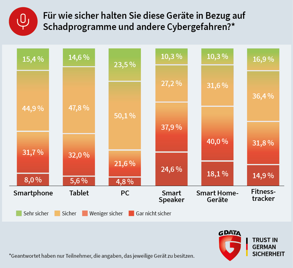 (pressebox) (Bochum, 13.09.2018) Die Deutschen misstrauen Smart Home-Geräten, wie eine repräsentative G DATA Umfrage zeigt. Auch wenn die Digitalisierung nicht vor dem eigenen Zuhause haltmacht, ist die Mehrheit skeptisch bei Smart Home-Geräten, Fitness Trackern oder Sprachassistenten (z.B. Amazons Alexa). Berichte über Datenlecks und andere Sicherheitsvorfälle mit den smarten Helfern sorgen für Verunsicherung bei den Verbrauchern. Das größte Vertrauen schenken mehr als sechs von zehn Nutzern dem „guten alten“ PC. In puncto EU-Datenschutzgrundverordnung sehen nur 38 Prozent der Deutschen auf der Unternehmensseite einen verantwortungsvolleren Umfang mit Nutzerdaten. Für das repräsentative G DATA IT-Security-Barometer wurden 1.000 deutsche Internetnutzer befragt.
