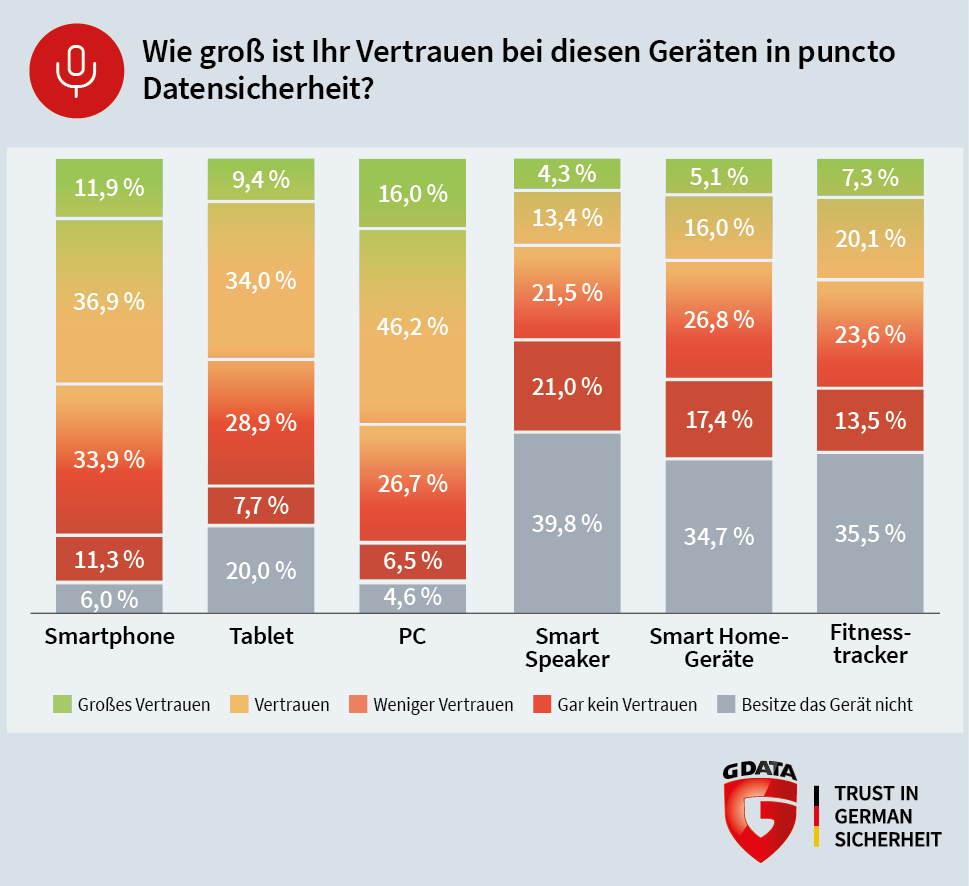 Mehr als sechs von zehn deutschen Internetnutzern vertrauen dem PC in puncto Datensicherheit, gefolgt von Smartphone und Tablet. Diese Geräte, insbesondere der Computer, sind bei vielen Anwendern täglich in Nutzung und dadurch etabliert. Die Deutschen fühlen sich sicher im Umgang mit den Devices und nutzen sie wie selbstverständlich. Gerade das Smartphone ist aus dem Alltag nicht mehr wegzudenken, so dass durch die daraus entstehende Bequemlichkeit das Vertrauen in das Gerät entsteht – unabhängig vom Sicherheitsempfinden. Denn viele Anwender nutzen Apps, obwohl Ihnen bekannt ist, dass diese sehr viele personenbezogene Daten sammeln. Kritisch sehen die Deutschen auch die Smart Home-Geräte und virtuellen Assistenten (zum Beispiel Alexa oder Siri): Mehr als 40 Prozent schenken diesen Devices wenig oder gar kein Vertrauen. Das liegt auch daran, dass viele Nutzer noch wenig Erfahrung mit den Geräten haben. Außerdem sorgen Medienberichte über Schwachstellen in Internet of Things-Geräten für Verunsicherung bei Verbrauchern.