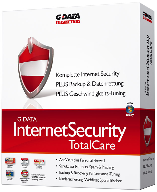 G DATA InternetSecurity TotalCare ist die ultimative All-In-One-Lösung im Bereich IT-Security. Das neue Premium-Produkt vereint die Sicherheitsfunktionen des Rekordtestsiegers G DATA InternetSecurity 2007 mit neuen richtungsweisenden Security-Technologien. Hierzu zählen unter anderem eine vollautomatische Datensicherung und der G DATA Systemtuner.