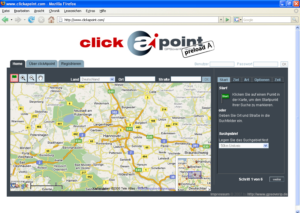Die Verarbeitung von GPS-Livedaten auf Google Maps Kartenmaterial, sowie sich sekündlich ändernde Suchergebnisse machen clickApoint zu einem der genialsten Projekte im Web 2.0. Wer seine LKW's/Autos mit speziellen GPS-Geräten ausrüstet, kann sogar während der Fahrt gefunden werden. In diesem Fall wird das Fahrzeug auf dem Kartenmaterial von Google Maps innerhalb eines bestimmten Radius angezeigt.