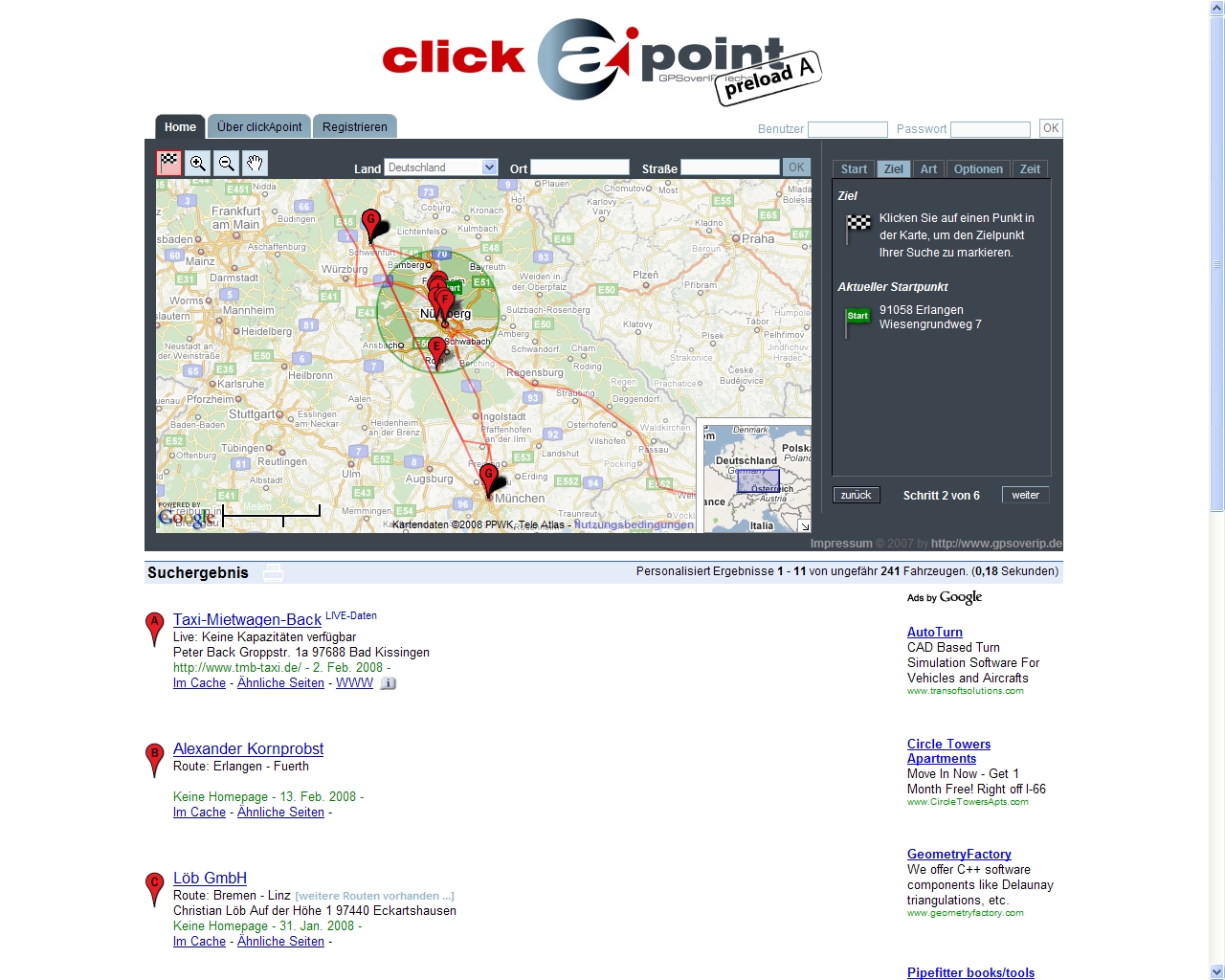 (pressebox) (Schweinfurt, 14.02.2008) Eine neue, auf Google™ Maps basierende Internetseite vereint Frachtenbörse und Mitfahrzentrale in Einem. Das Besondere an dem neuen Angebot ist die Verarbeitung der Daten auf dem Kartenmaterial von Google™ Maps. Der Internetkonzern Google™ stellt mit Google™ Maps ein sehr hochwertiges digitales Kartenmaterial zur Verfügung. Gibt ein Anbieter nun den Start und das Ziel einer Fahrt ein, so erscheinen für den Suchenden sogar die Orte, welche in einem bestimmten Radius entlang der Strecke liegen. Dadurch ist die Chance auf eine Vermittlung ungleich höher als bei bereits existierenden Mitfahr- oder Frachtbörsen. Den Hintergrund der Entwicklung von www.clickApoint.com liefert die allgemeine weltweite Verkehrsentwicklung, wonach ein Anstieg des Verkehrsaufkommens um 25% für die nächsten 15 Jahre vorhergesagt wird. Hier kann die Nutzung intelligenter Internetplattformen enorm dazu beitragen, den bestehenen Verkehr optimal zu nutzen um damit Ressourcen zu schonen, ohne das die wirtschaftliche Entwicklung eingeschränkt wird. clickApoint.com ist seit dem 11.01.2008 im Internet verfügbar und sowohl für gewerbliche als auch private Nutzer vollkommen kostenfrei.