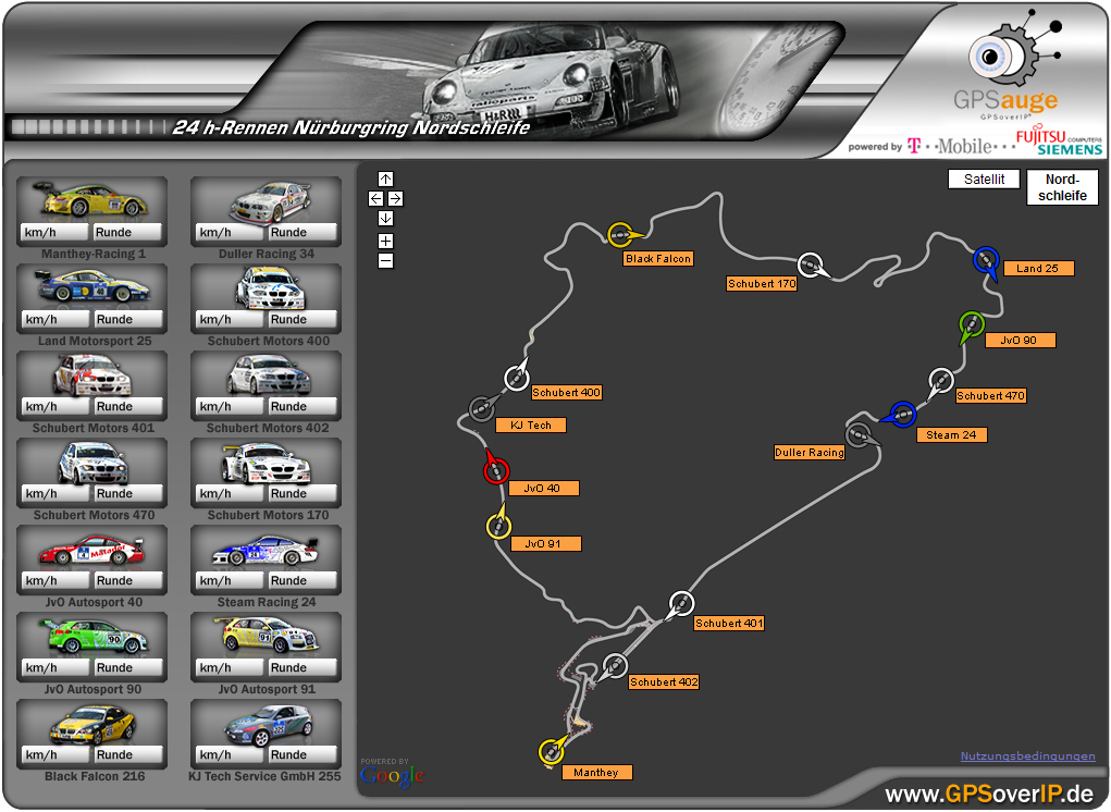 Die GPSoverIP GmbH verfügt über patentierte Technologien, welche eine schnelle und sichere Datenübertragung aus bewegten Objekten im Mobilfunknetz erlauben. Für die Teams beim 24h-Rennen ist das ein unbezahlbarer Wettbewerbsvorteil - weiss man doch immer genau welches Fahrzeug sich wo befindet, wieviel Benzin noch im Tank ist, wie hoch die Motortemperatur ist etc. Eines der ersten Teams welches GPSover/DATAoverIP, so der Name der Technologie, eingesetzt hat ist der Seriensieger Manthey Racing. Ein weiteres bekanntes Team ist NISSAN Racing, bekannt aus dem GRIP Motormagazin auf RTL II.