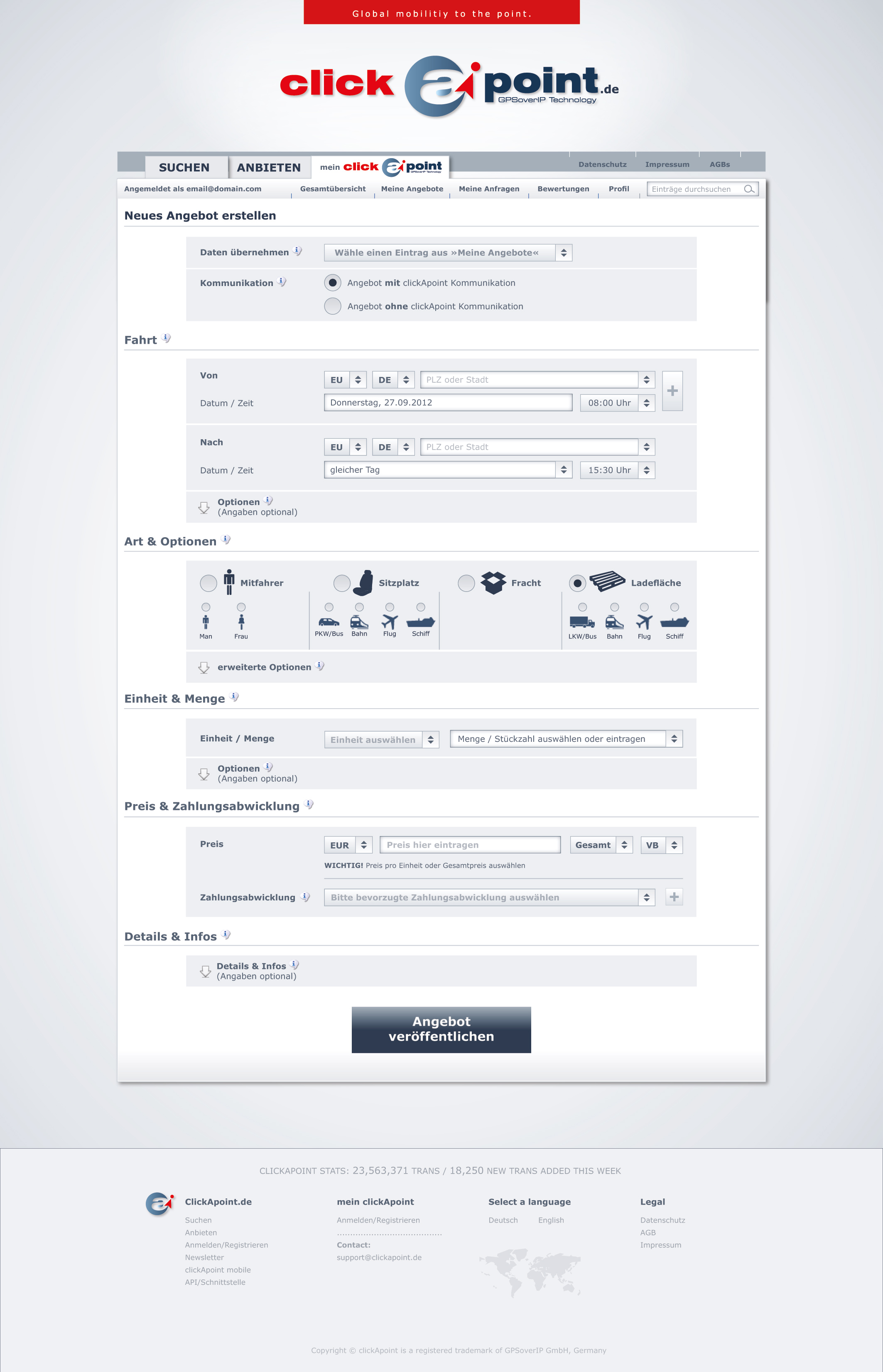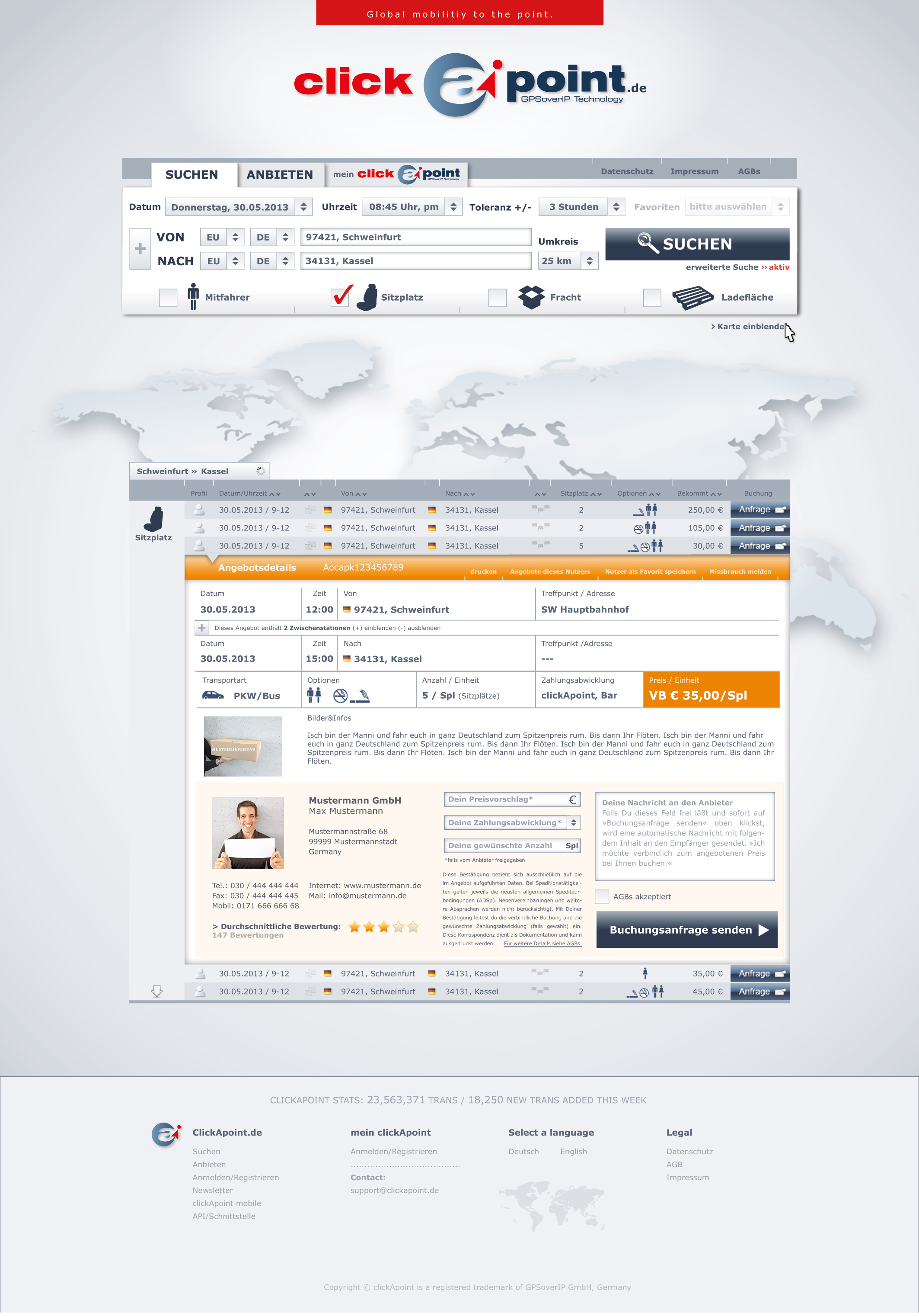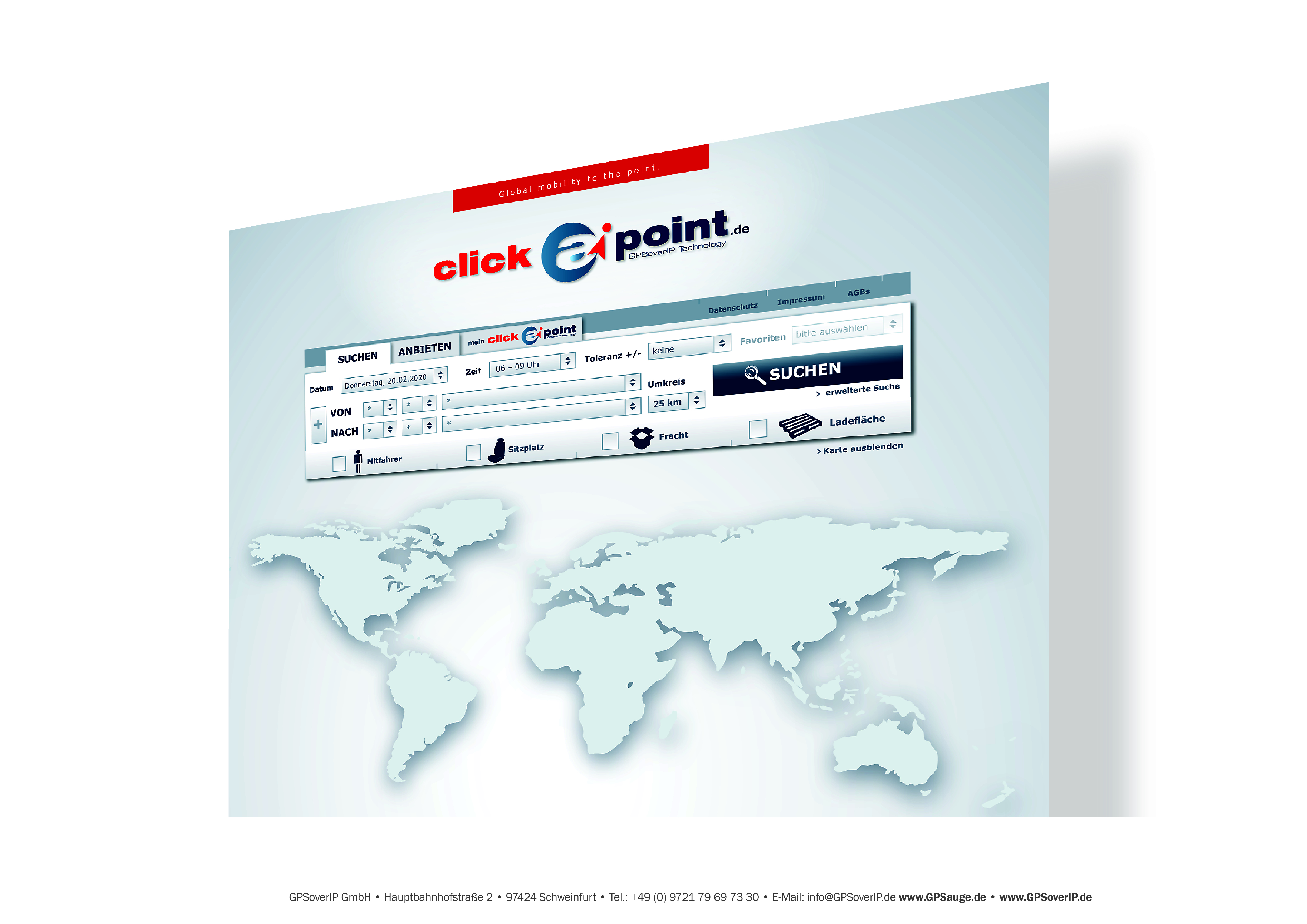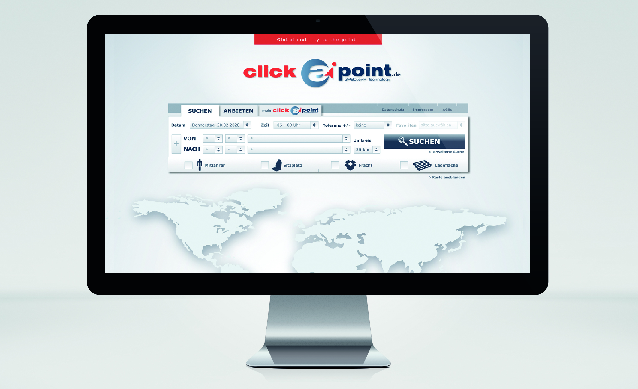 Die Website clickApoint.com versteht sich als ein globales Netzwerk der Mobilität. Dabei bezieht sich der Begriff „Global“ sowohl auf die Nutzervielfalt wie auch auf die internationale Ausrichtung. Im Gegensatz zu statischen Transportbörsen handelt es sich dabei jedoch um eine dynamische und transparente Plattform, die jeder völlig kostenfrei und vollumfänglich nutzen kann. So sind weder umständliche Verträge abzuschließen noch Registrierungen notwendig, um beispielsweise alle Angebote einsehen zu können.