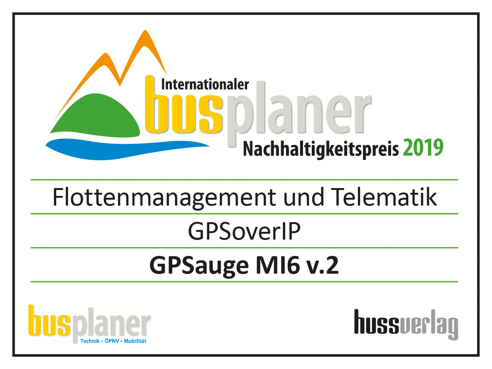 André Jurleit - Geschäftsführer der GPSoverIP GmbH - durfte die Auszeichnung im feierlichen Rahmen der Schirmherrschaft des Huss-Verlages (Herausgeber der Zeitschrift „busplaner“) von Frau Michaela Pech (Anzeige-Leiterin/Huss-Verlag) und Herrn Bert Brandenburg (Geschäftsführer/Huss-Verlag) im Marshall-Haus in Berlin während des Bus2Bus-Messe 2019 entgegennehmen.
