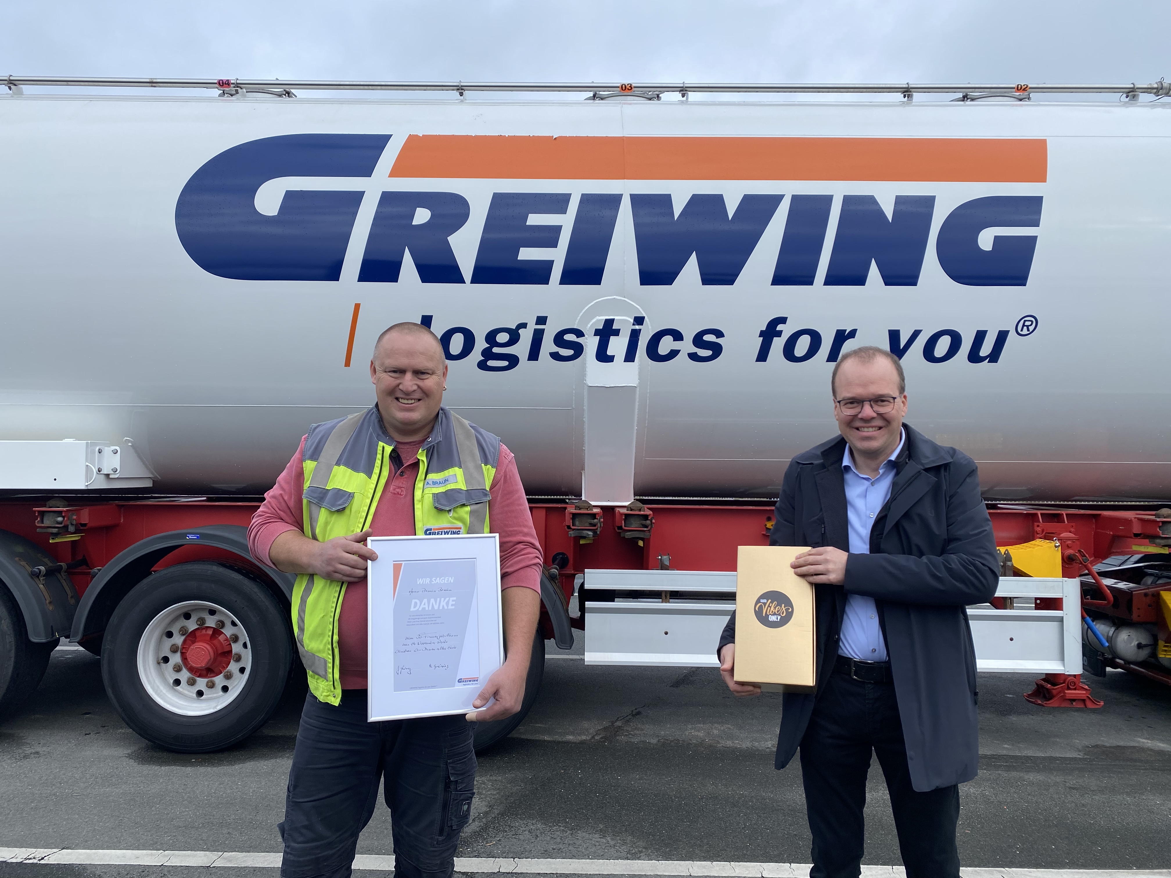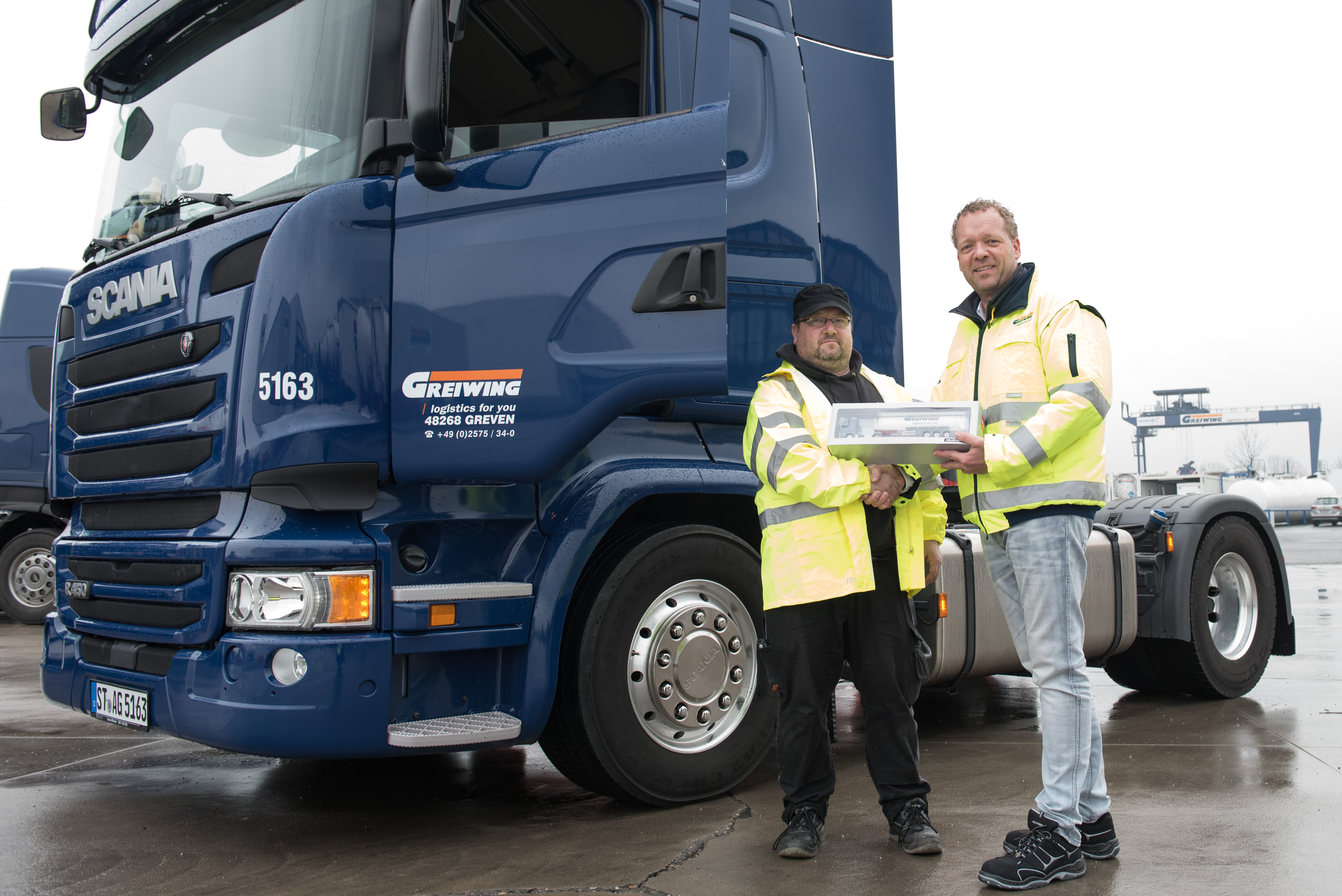 Fahrer und Jubilar Dirk Krätzschmar (rechts im Bild) mit Ludger Wieskamp, Disponent der GREIWING logistics for you GmbH am Standort Greven. Foto: GREIWING
