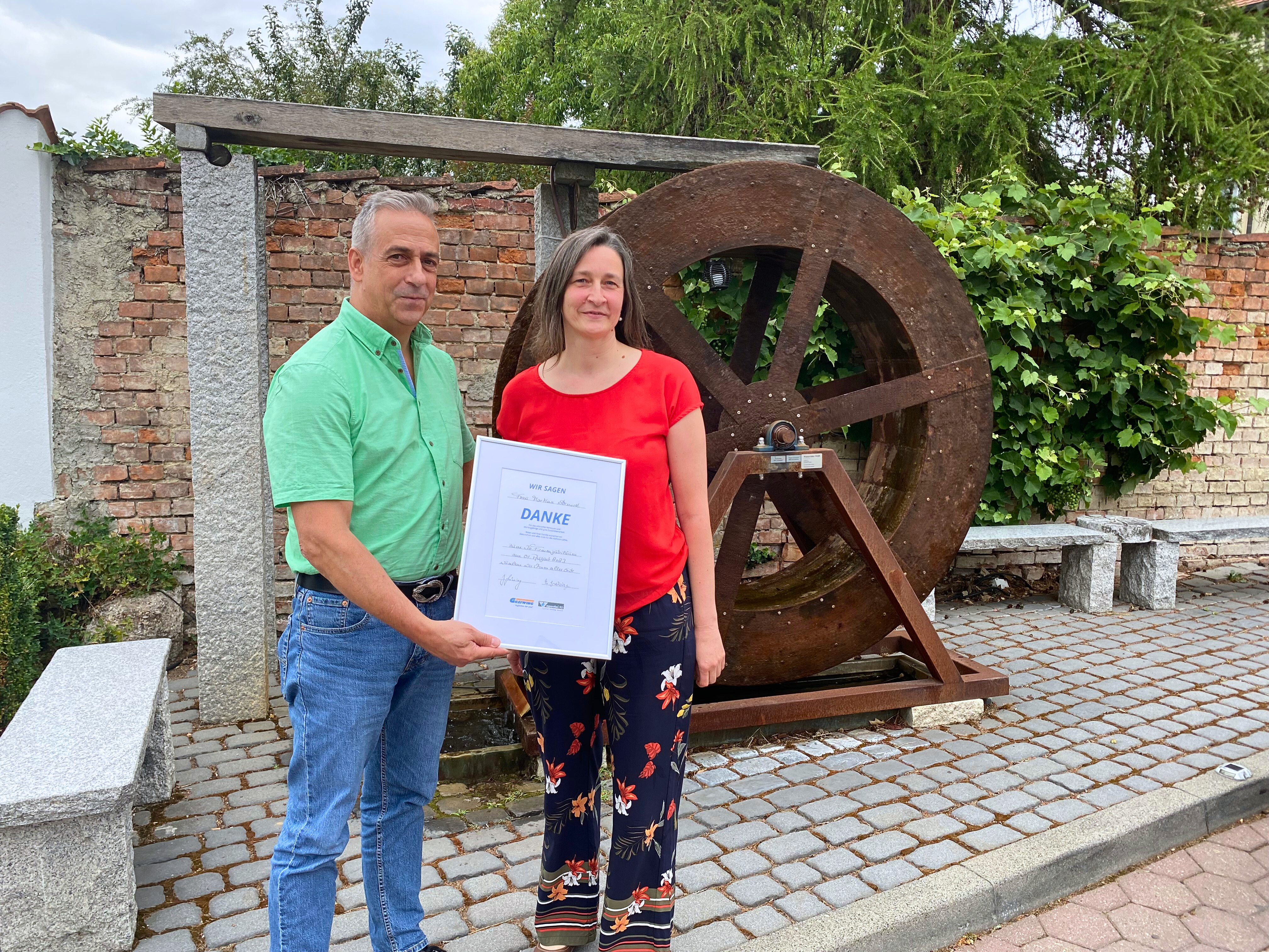 Auszeichnung für 30 Jahre Firmentreue: Martin Mallen, Niederlassungsleiter Leipheim der GREIWING logistics for you GmbH, überreicht Martina Schmidt die Jubiläumsurkunde. (Foto: GREIWING)