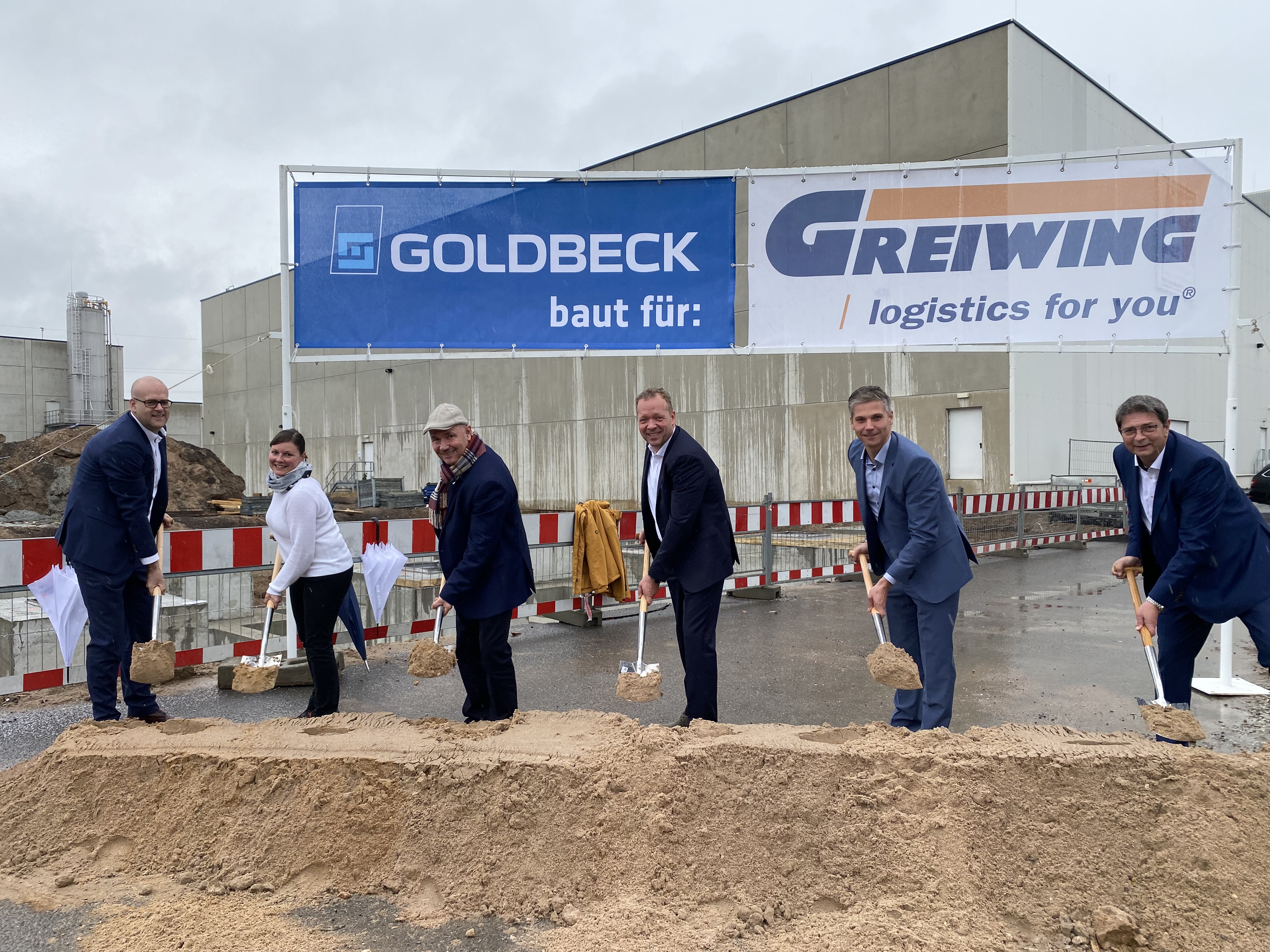 Am Dienstag fand der Spatenstich für die Erweiterung des Standorts in Worms statt. Mit dabei waren (v.l.): Matthias Gehrigk (Geschäftsführer GREIWING), Stephanie Künzel (Niederlassungsleiterin Rhein-Main-Gebiet), Adolf Kessel (Oberbürgermeister Worms), Jürgen Greiwing (Geschäftsführender Gesellschafter GREIWING), Christian Terwey (Niederlassungsleiter GOLDBECK Münster) und Matthias Geiß (Geschäftsführer GREIWING). (Foto: GREIWING logistics for you GmbH).