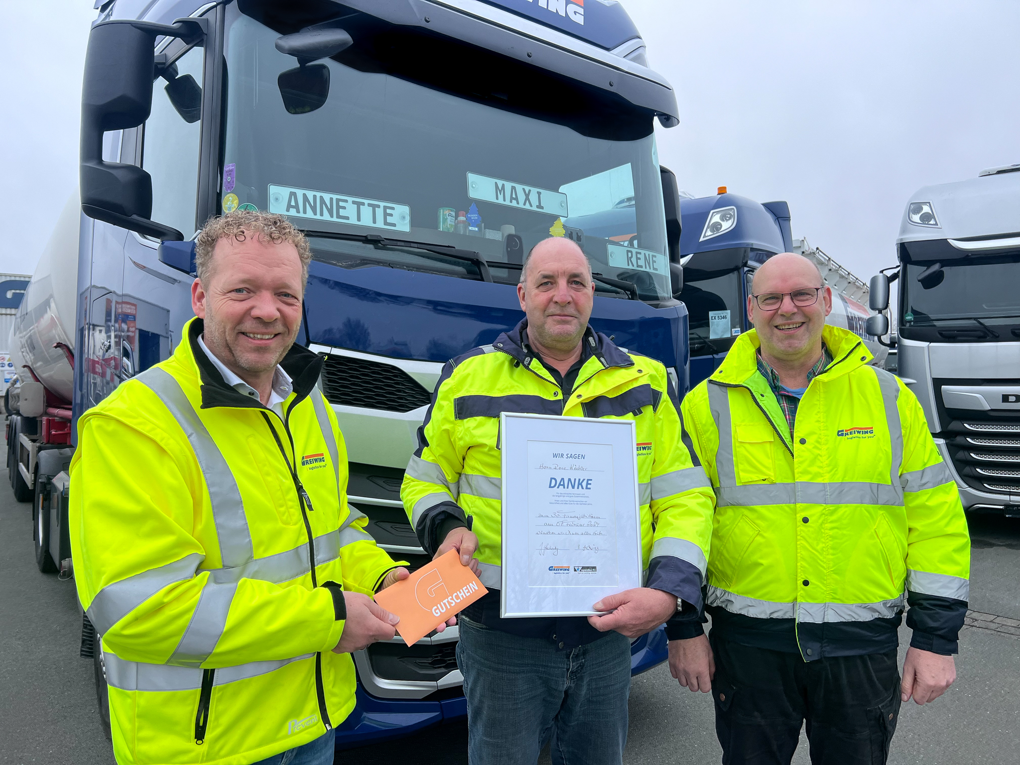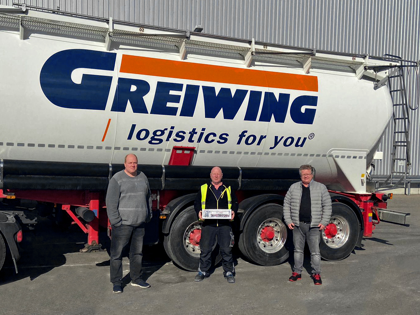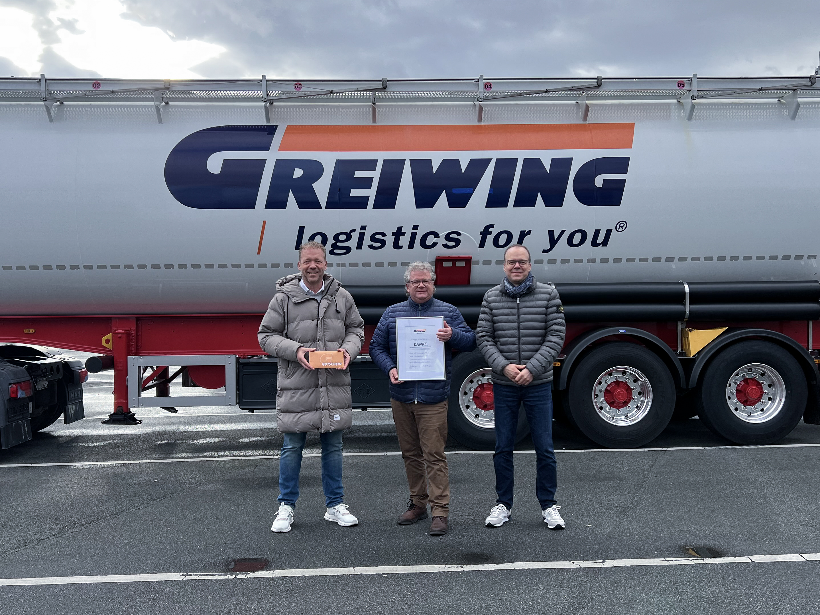 Bildunterzeile: 30 Jahre bei GREIWING: Fahrer Franz Peter (Mitte) mit GREIWING-Geschäftsführer Jürgen Burgholz (links) sowie Ulrich Daßmann, Dispositionsleiter am Standort Greven. (Foto: GREIWING logistics for you GmbH)