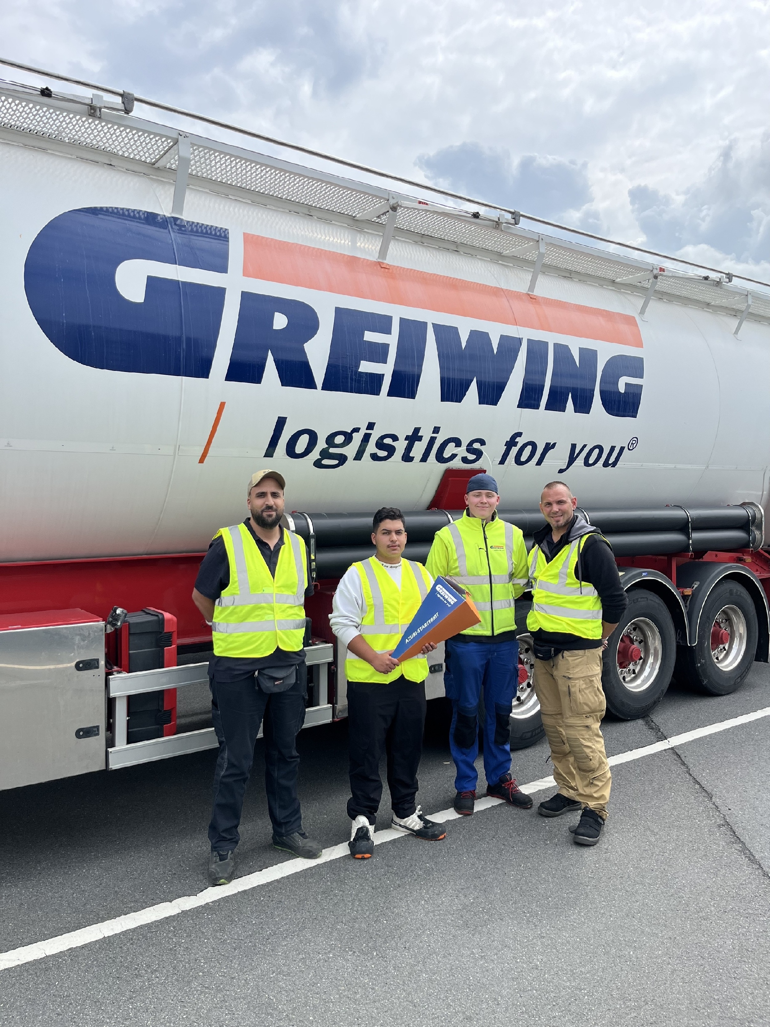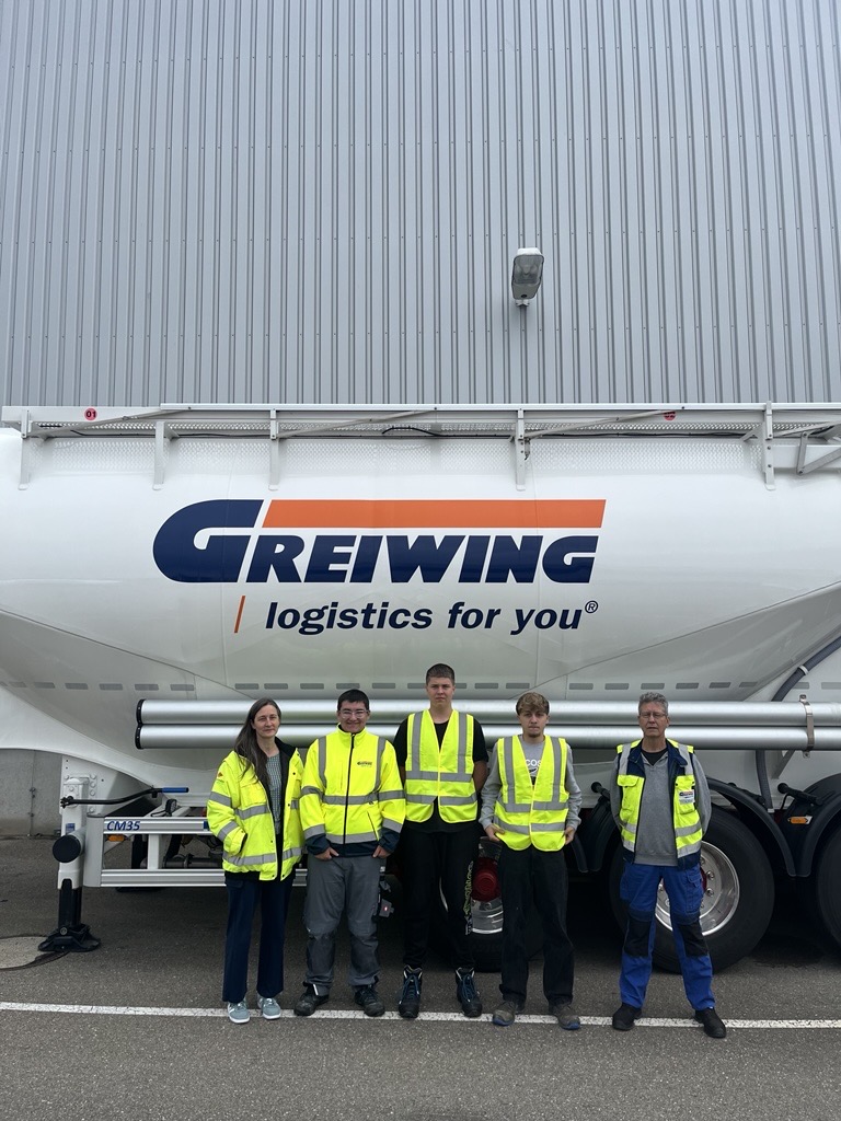 GREIWING begrüßt einen Auszubildenden in Burghausen (v.l.): Teamleiter Verwaltung/Abfertigung/Abrechnung und Ausbilder und Nico Rohrer und Lisa-Marie Täser (Kauffrau für Büromanagement).