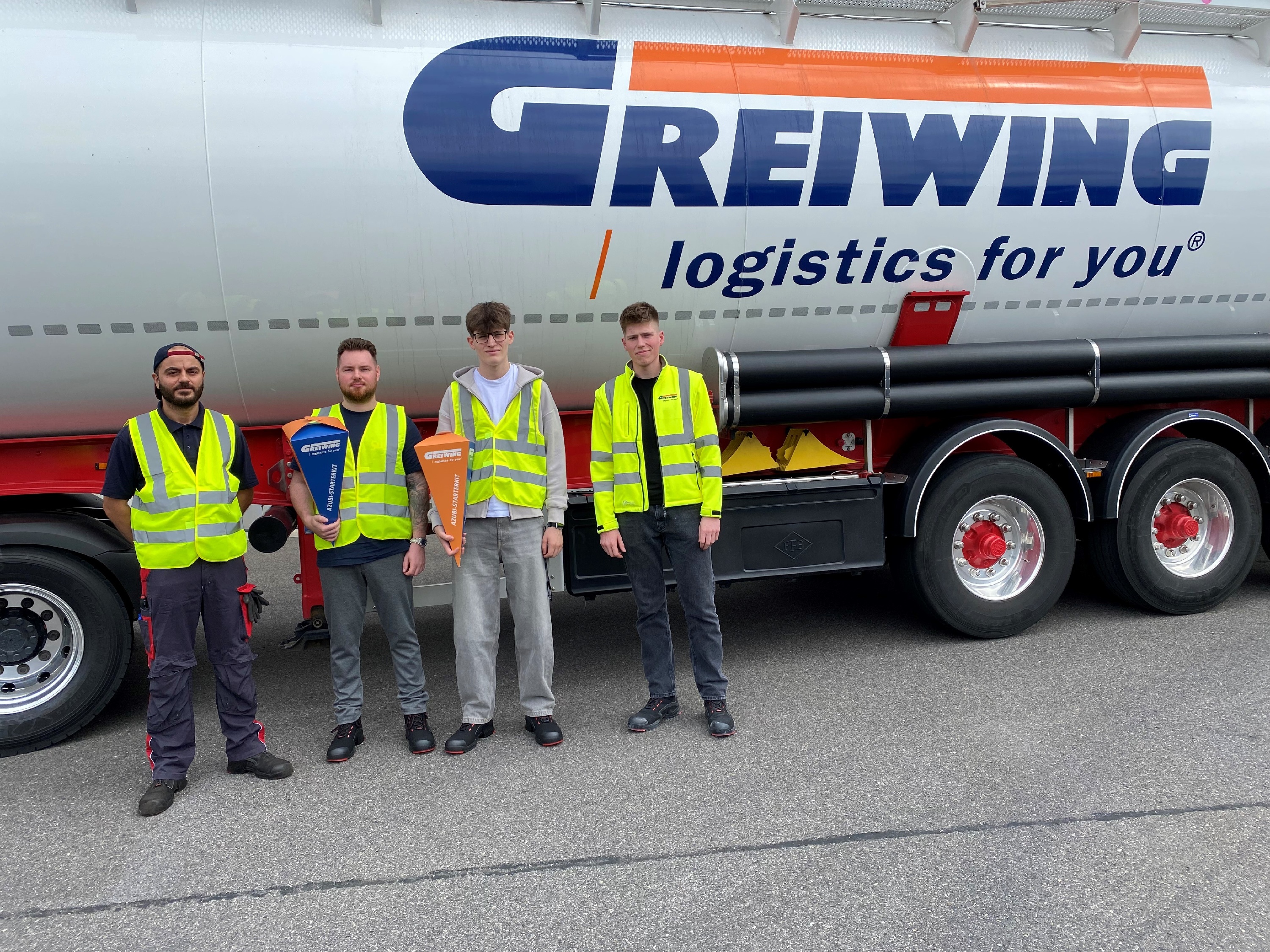 Vier neue Auszubildende wurden in Duisburg von GREIWING empfangen (v.l.): Werkstattmeister & Ausbilder Ismail Günsan, Dominik Klanthe (Berufskraftfahrer), Erik Knorr (Industriemechatroniker) und Fynn Knorr (Kaufmann für Spedition und Logistikdienstleistung im zweiten Ausbildungsjahr & Pate der neuen Auszubildenden).