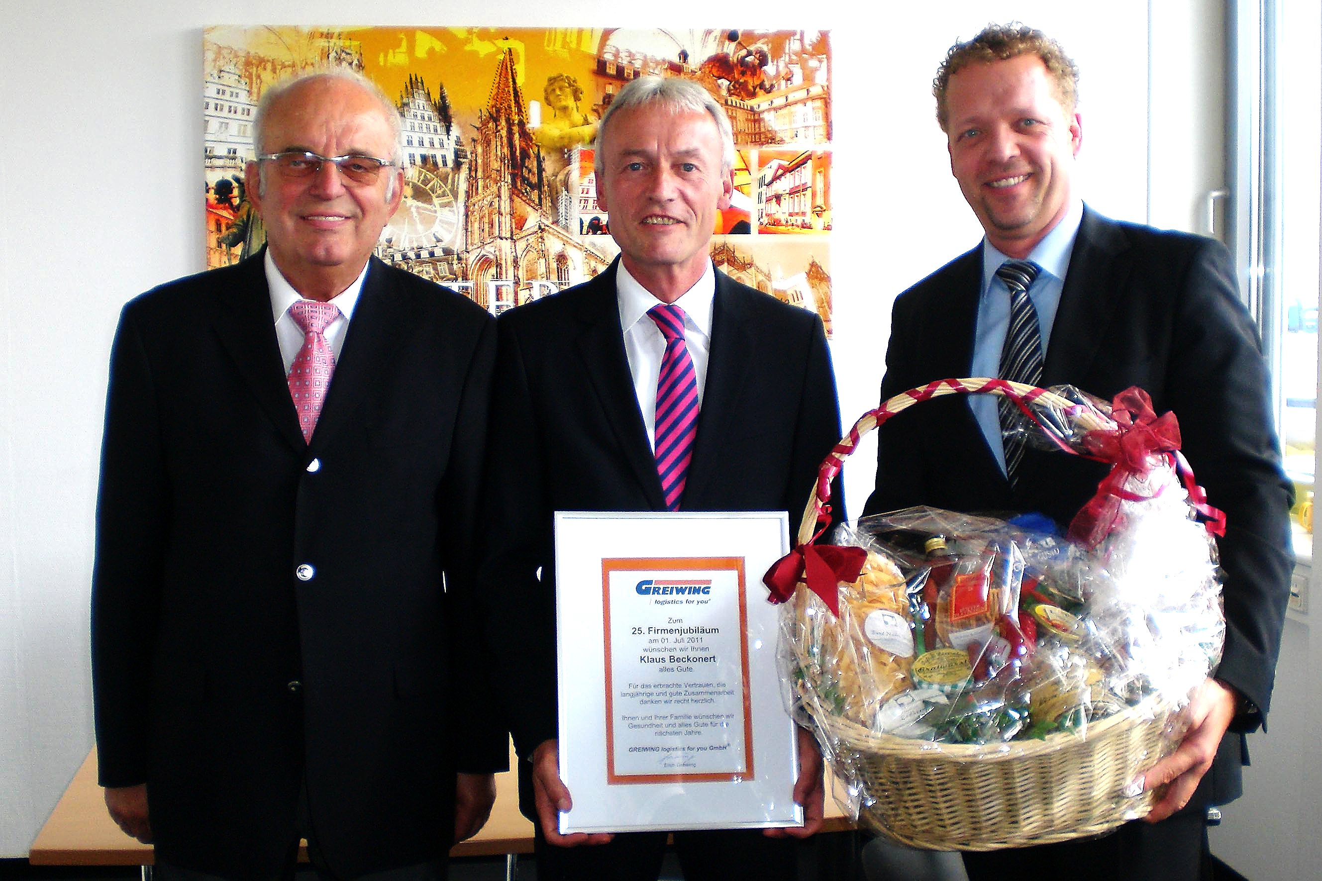 Der Geschäftsführende Gesellschafter der GREIWING logistics for you GmbH, Roland Greiwing, (rechts) und Philipp Keil (links) ehrten Dirk Olislagers für seine 25-jährige Treue zum Unternehmen.