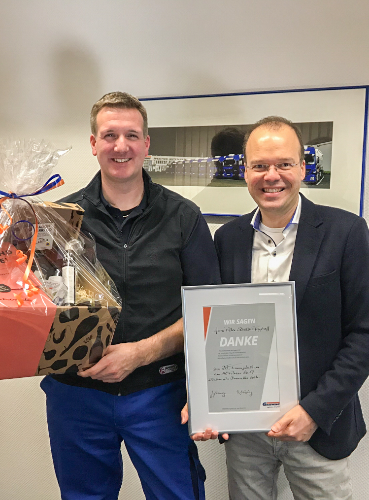 GREIWING-Geschäftsführer Roland Greiwing (r.) beglückwünschte Peter Schulze-Topphoff (l.) zum silbernen Dienstjubiläum / Foto: GREIWING logistics for you GmbH