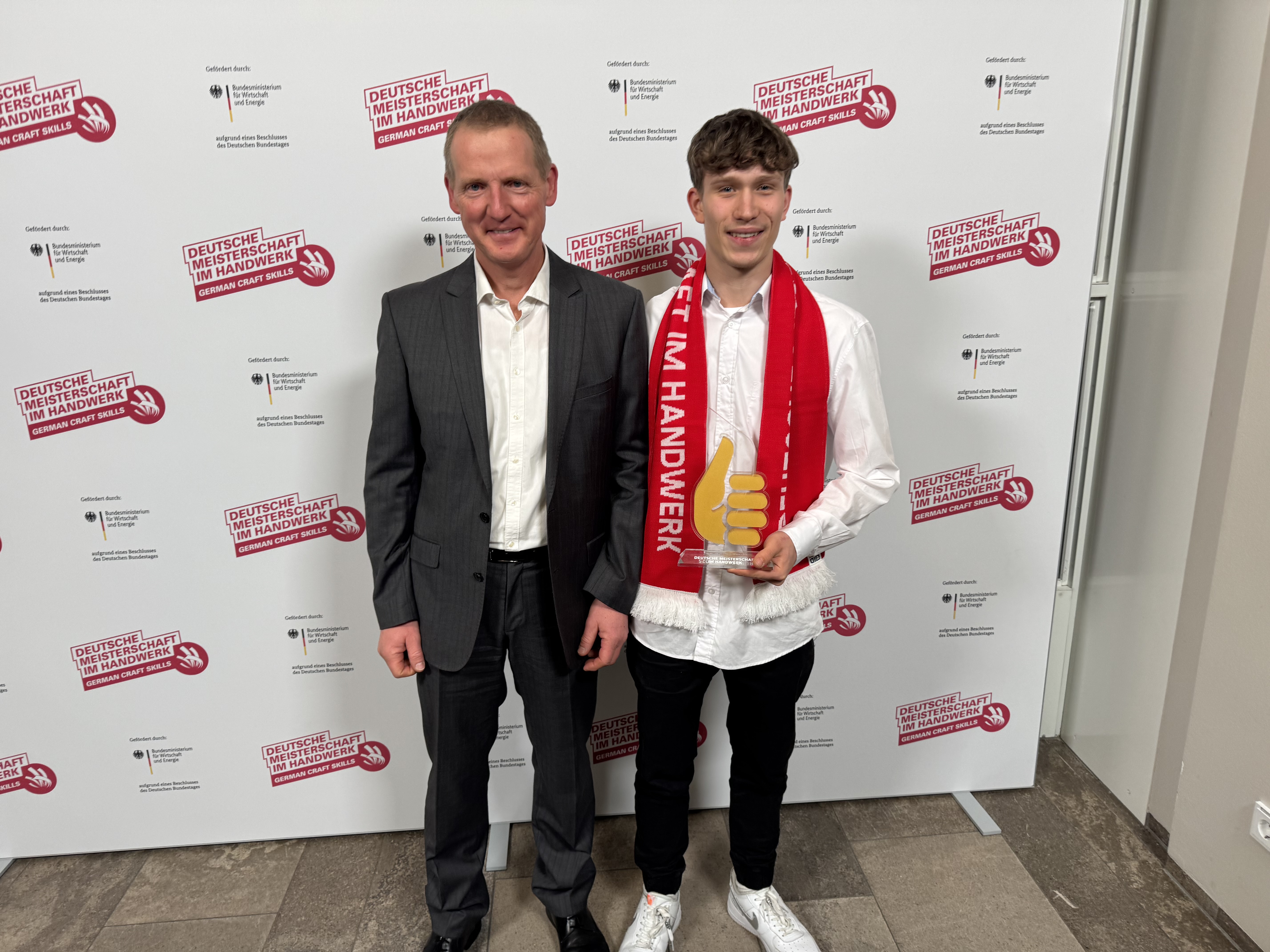 So sieht ein Bundessieger aus: Technischer Modellbauer Nils Gerken zählt zu den Bundessiegern bei der „Deutschen Meisterschaft im Handwerk – German Craft Skills 2025“. Christian Grabenauer (links) von der Handwerkskammer Karlsruhe gehört zu den ersten Gratulanten. Foto: HWK