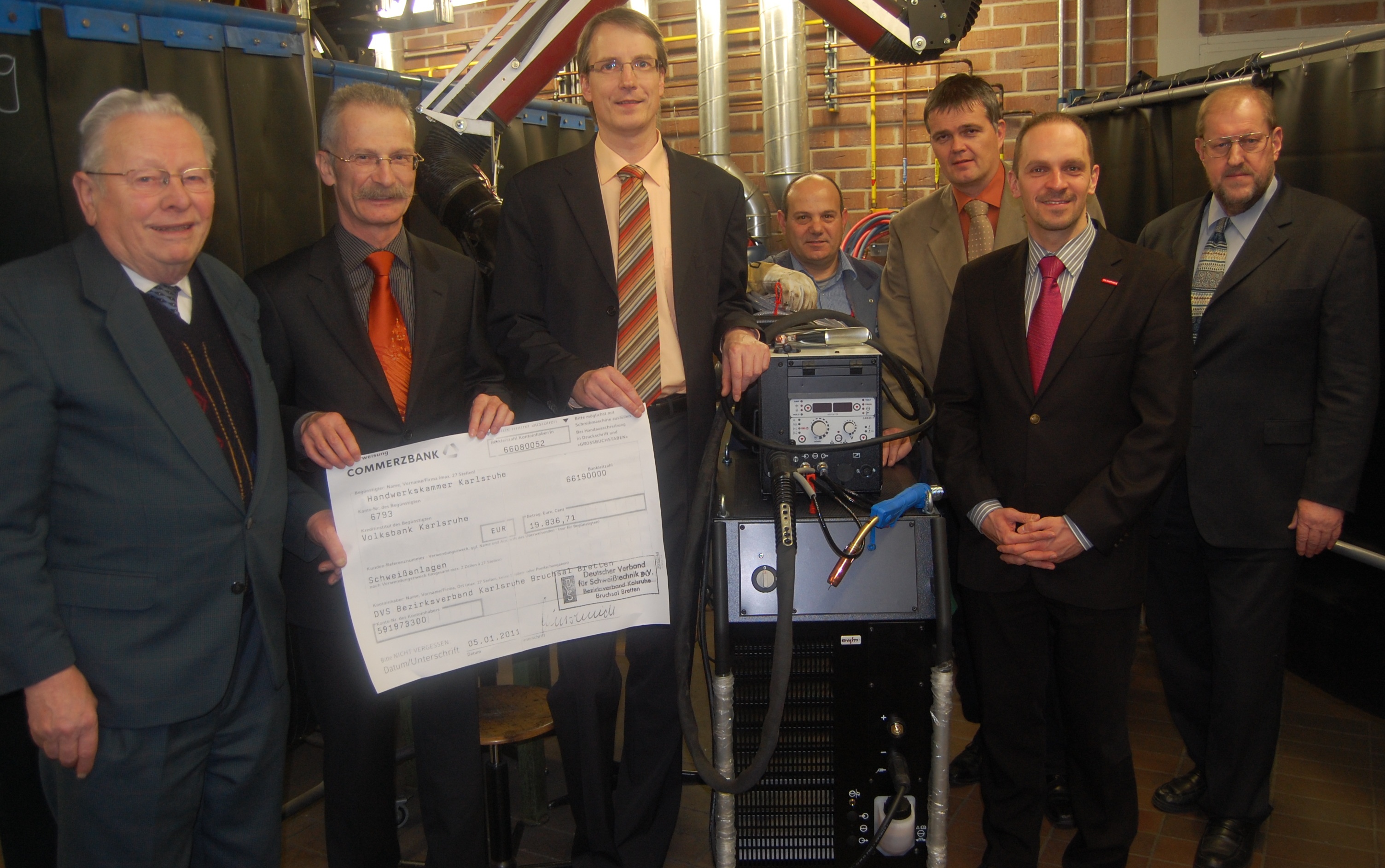 Der Deutsche Verband für Schweißen (DVS) – Bezirksverband Karlsruhe-Bruchsal-Bretten – hat der Schweißtechnischen Lehranstalt der Handwerkskammer Karlsruhe neue Schweißgeräte im Wert von fast 20.000 Euro zur Verfügung gestellt. Es freuen sich: v. l. n. r. Erwin Reinschmidt (DVS), Gerd Lutz (Handwerkskammer Karlsruhe), Randolf Diel (DVS), Antonino Porcedda, Torsten Faust, Dr. Patrick Jakob, Konrad Kellner (alle Handwerkskammer Karlsruhe) / Foto: HKKA