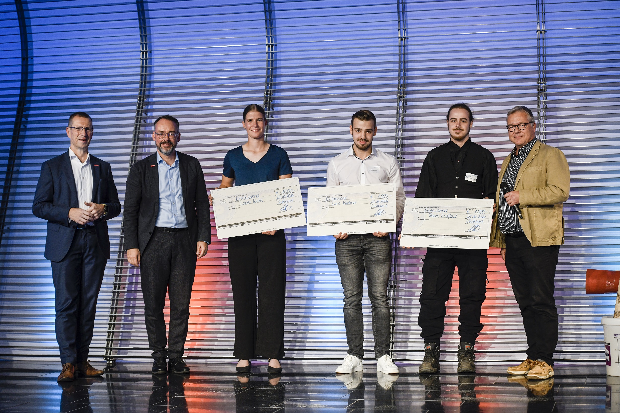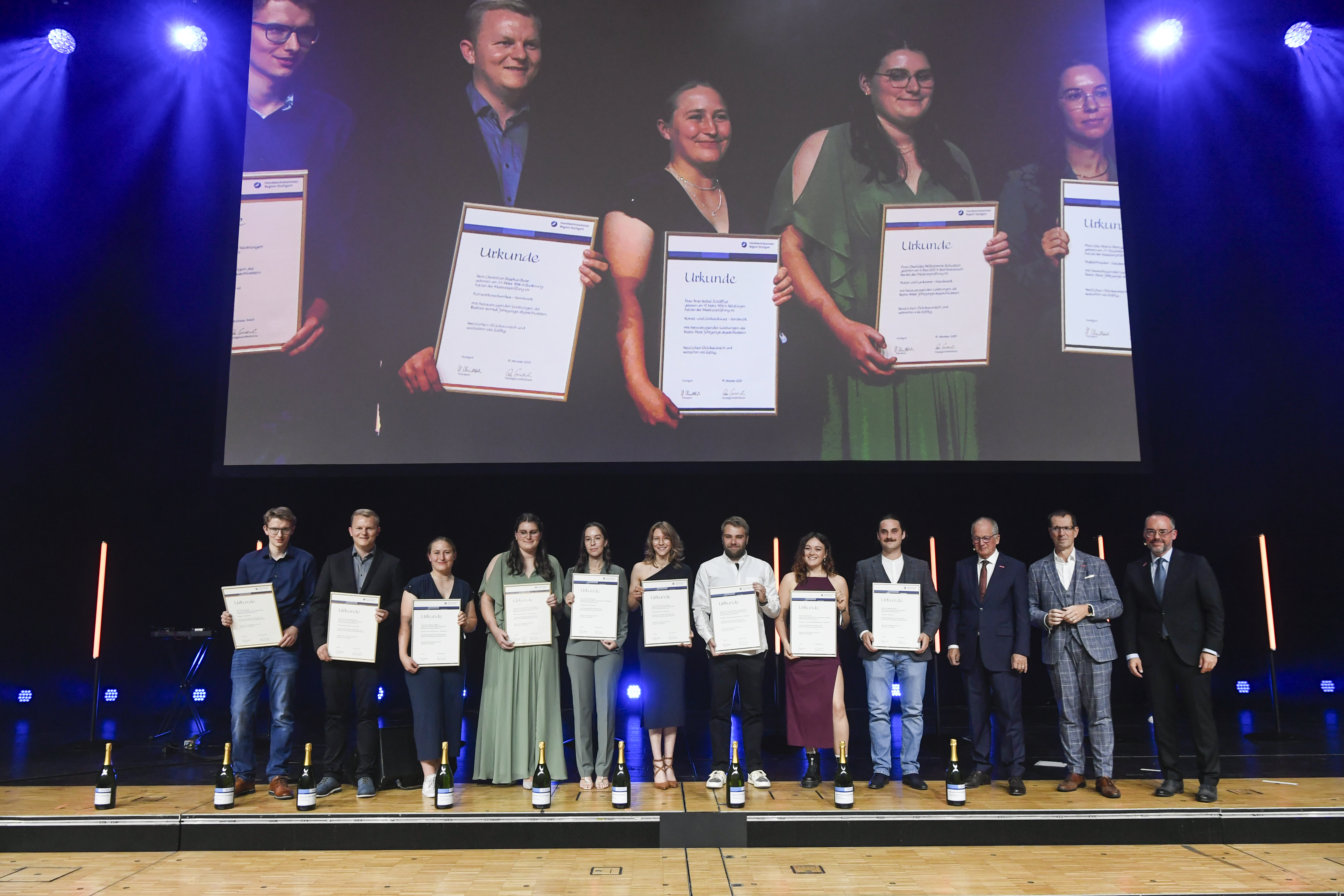 Thomas Bürkle, Vizepräsident von Handwerk BW (rechts), gratuliert den Nachwuchstalenten aus der Region Stuttgart zu ihrer hervorragenden Leistung im bundesweiten Berufewettbewerb.
